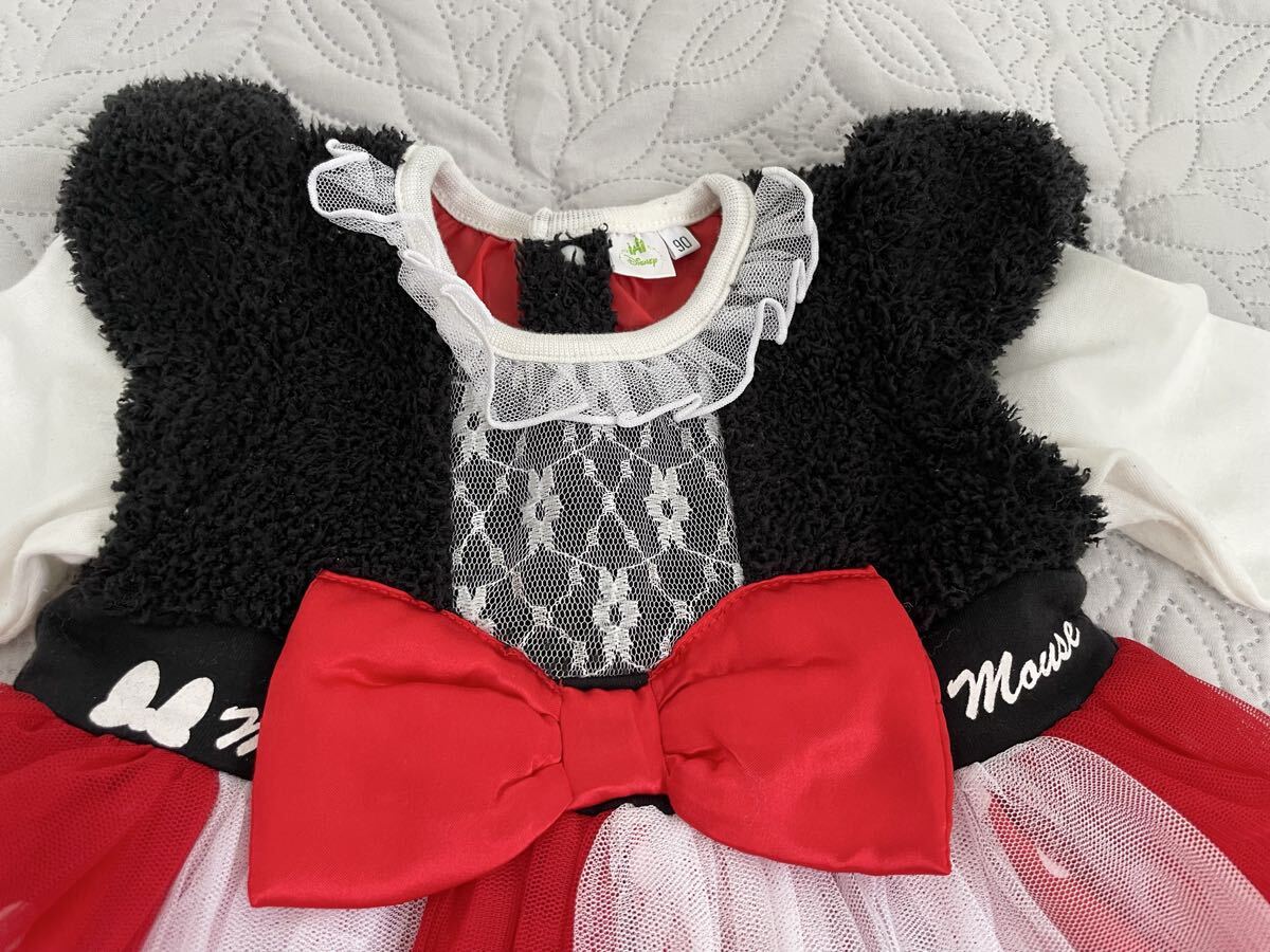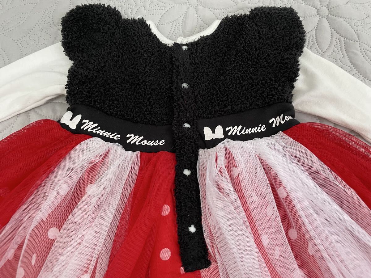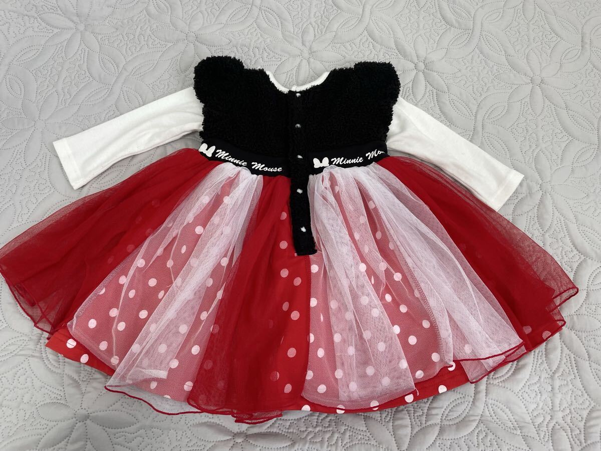 used◆90◆ミニー 長袖ドレス 〔上部分・ボア重ね着風〕〔スカート部分・シフォン・T素材ドット柄〕裏地付き◆赤・黒系