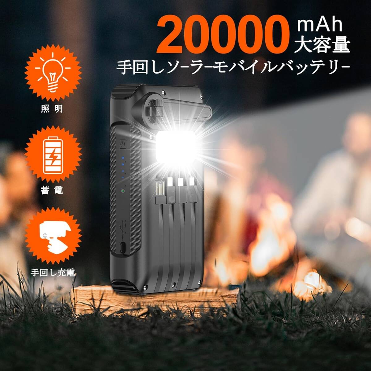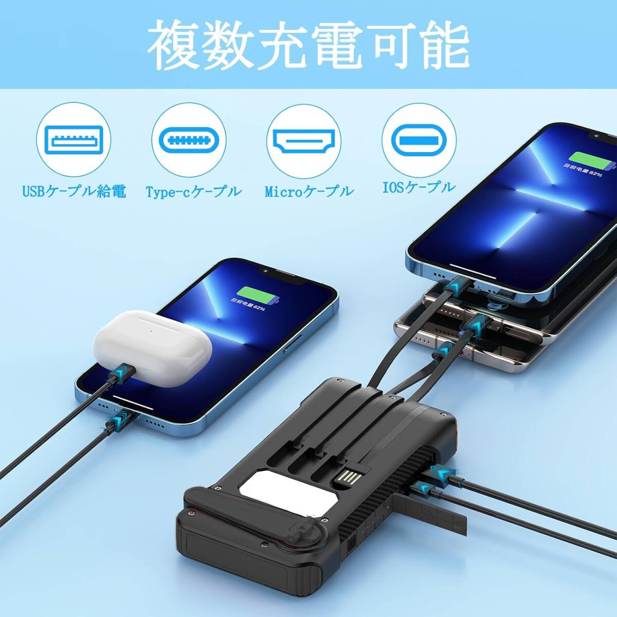 モバイルバッテリー ソーラーモバイルバッテリー 手回し充電 ソーラー充電器 大容量屋外緊急 ポータブルソーラーモバイルバッテリー PD22.5W急速充電 4本ケーブル内蔵 Type-C入出力兼用 太陽光充電 IP65防水 LEDライト付き スマホ 充電器 耐衝撃 スマホ充電器 停電/災害/旅行/アウトドア用 防災グッズ PSE認証済 日本語取扱説明書