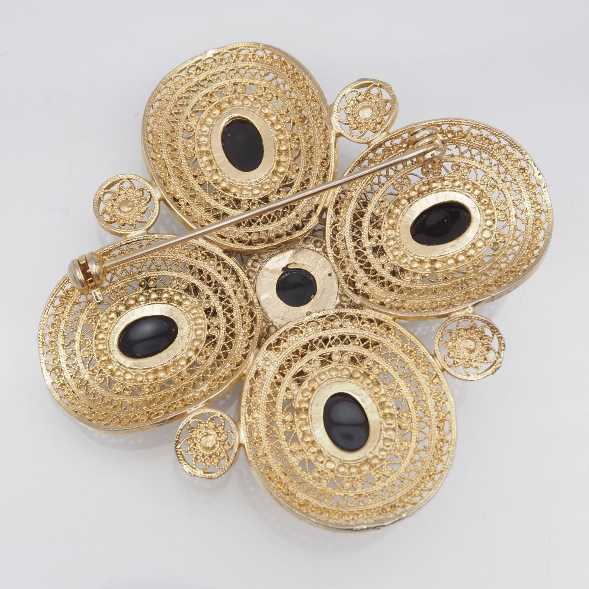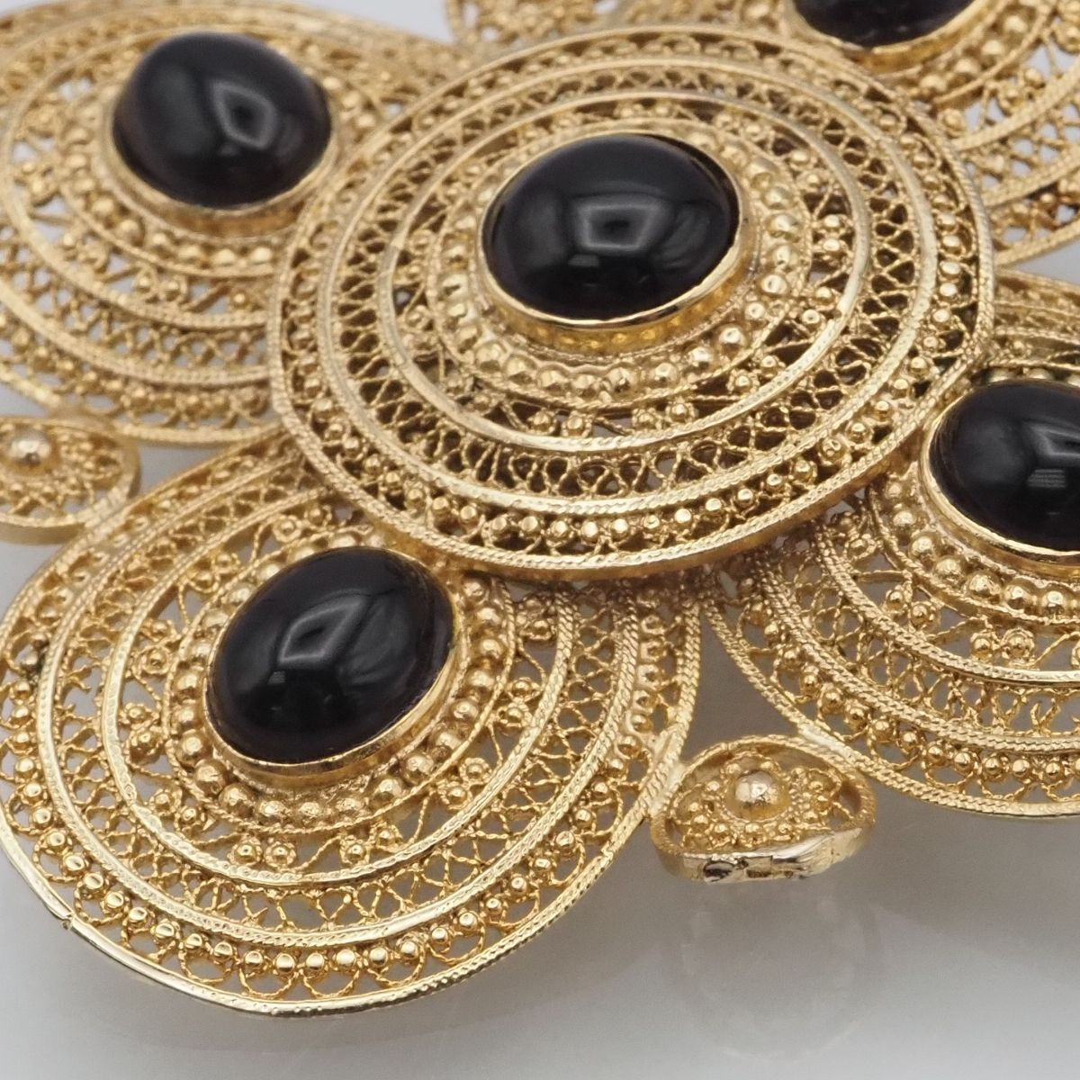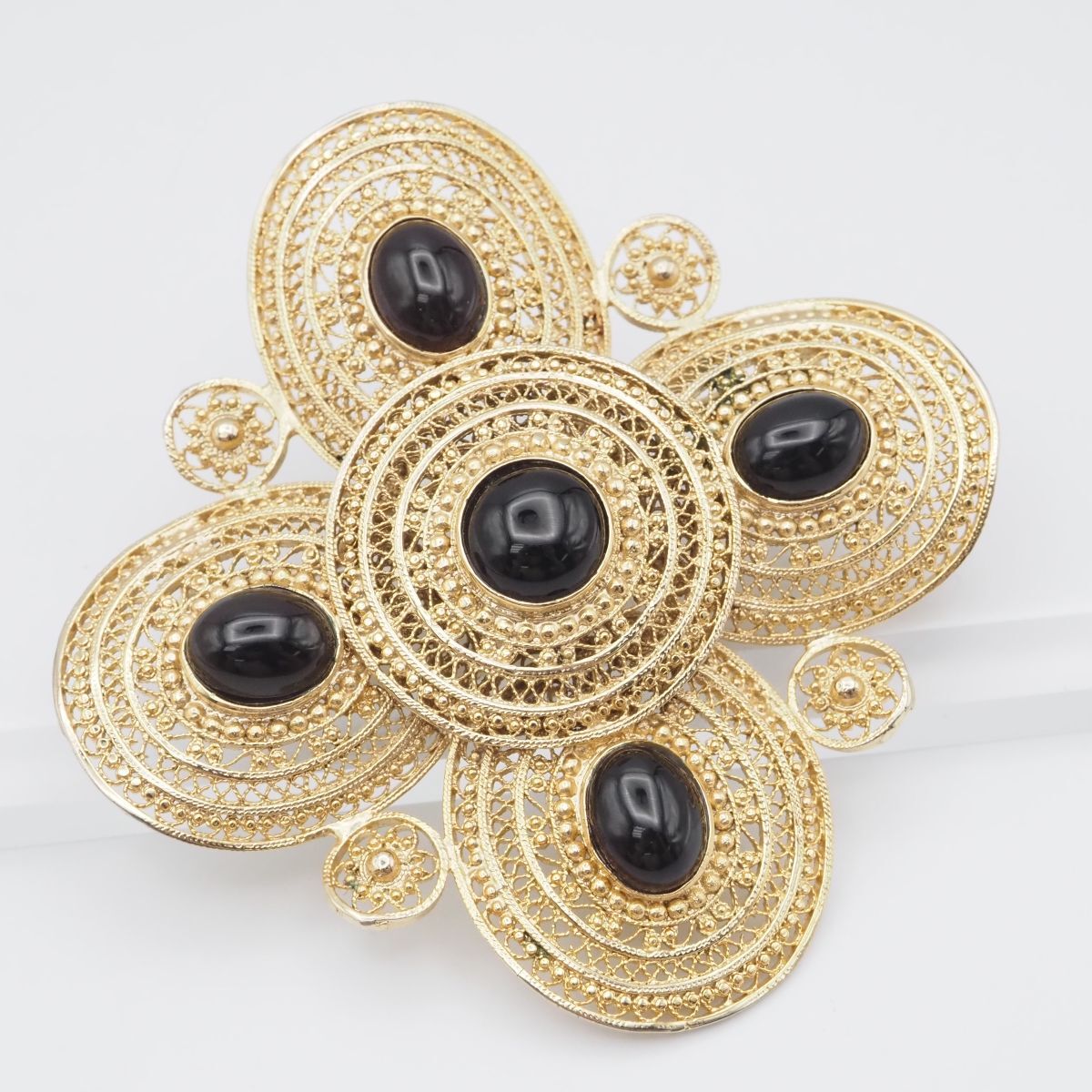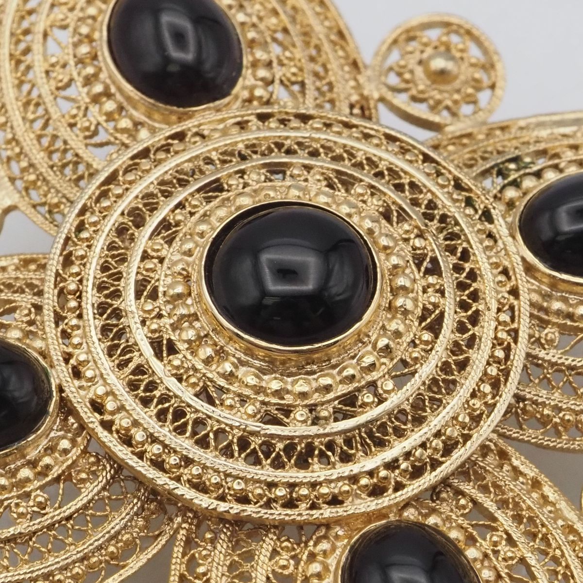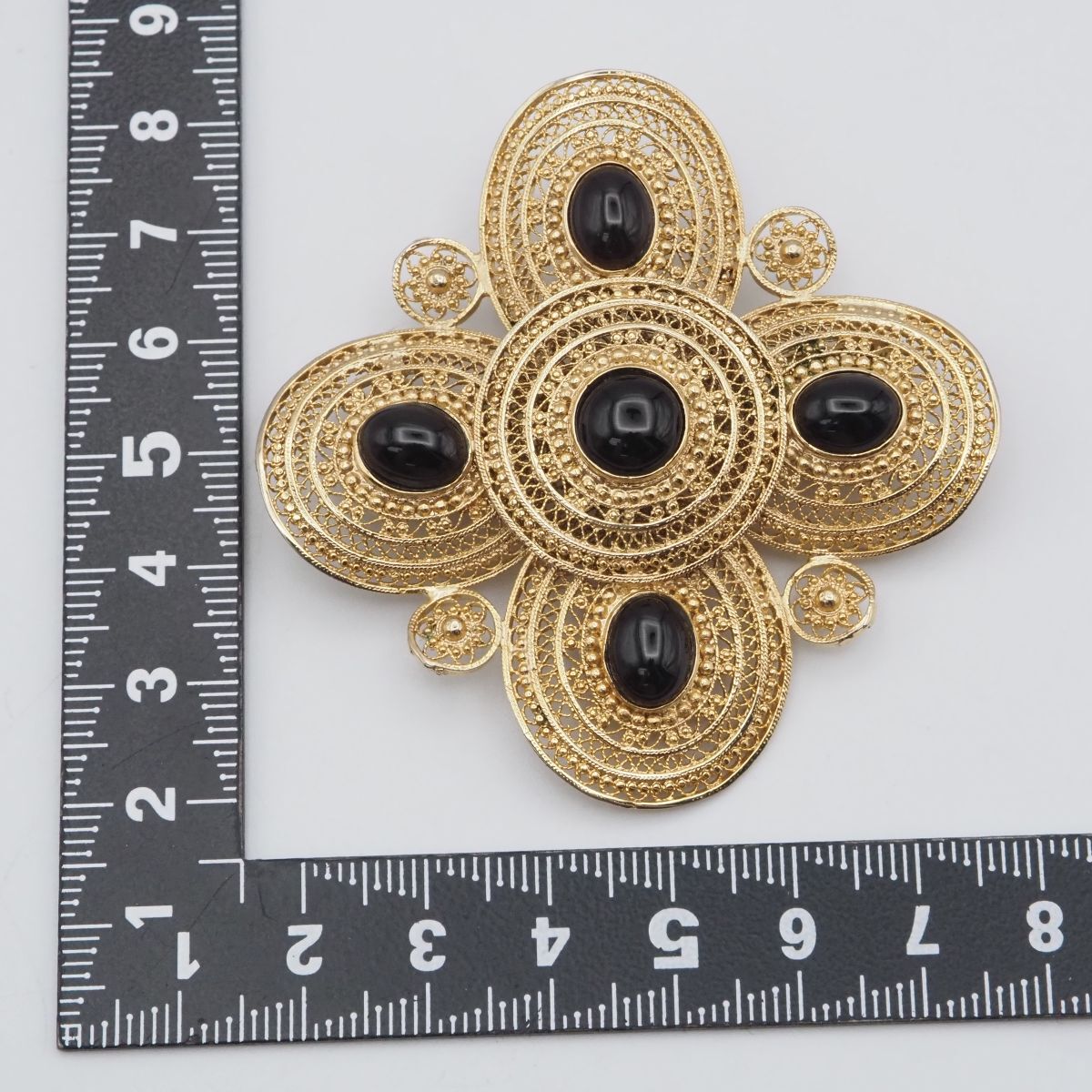 F468 ブローチ 大ぶり オニキス風 フィリグリー 銀線細工 ゴールド デザイン コスチュームジュエリー