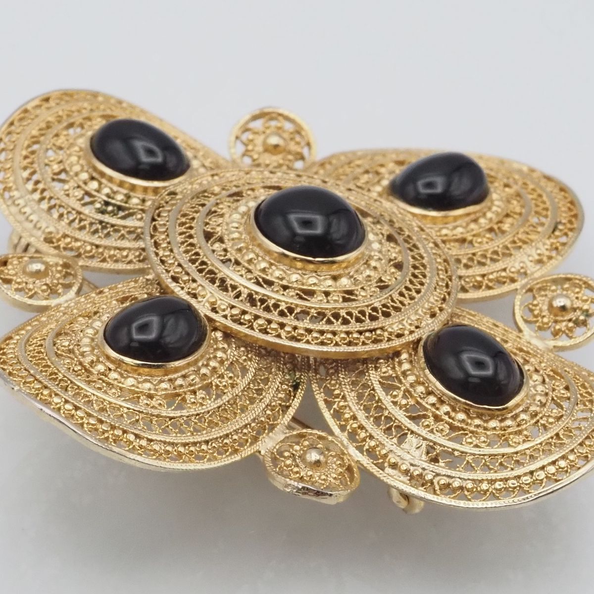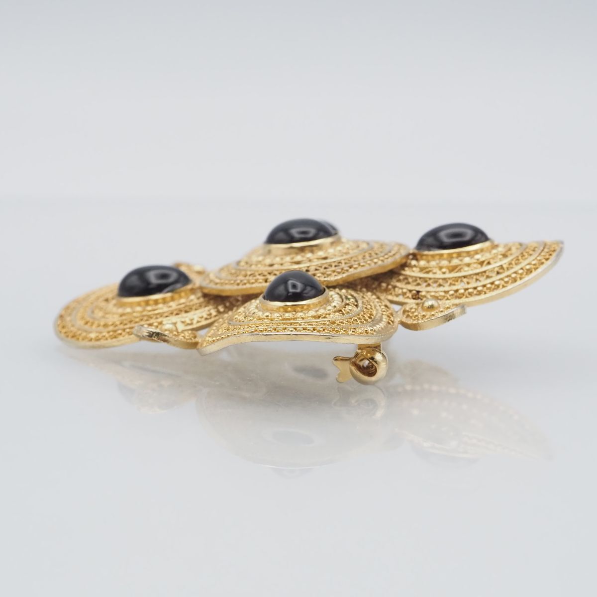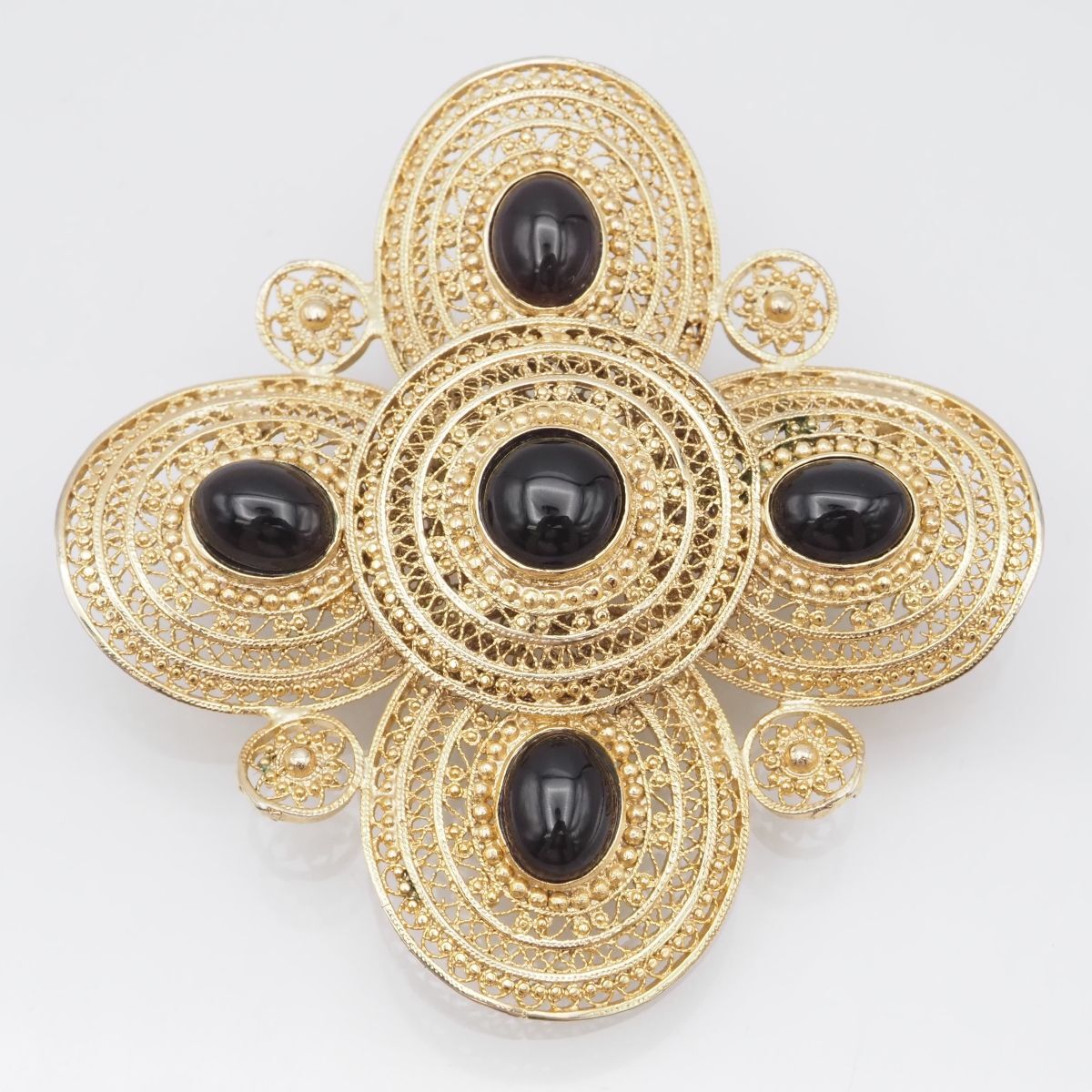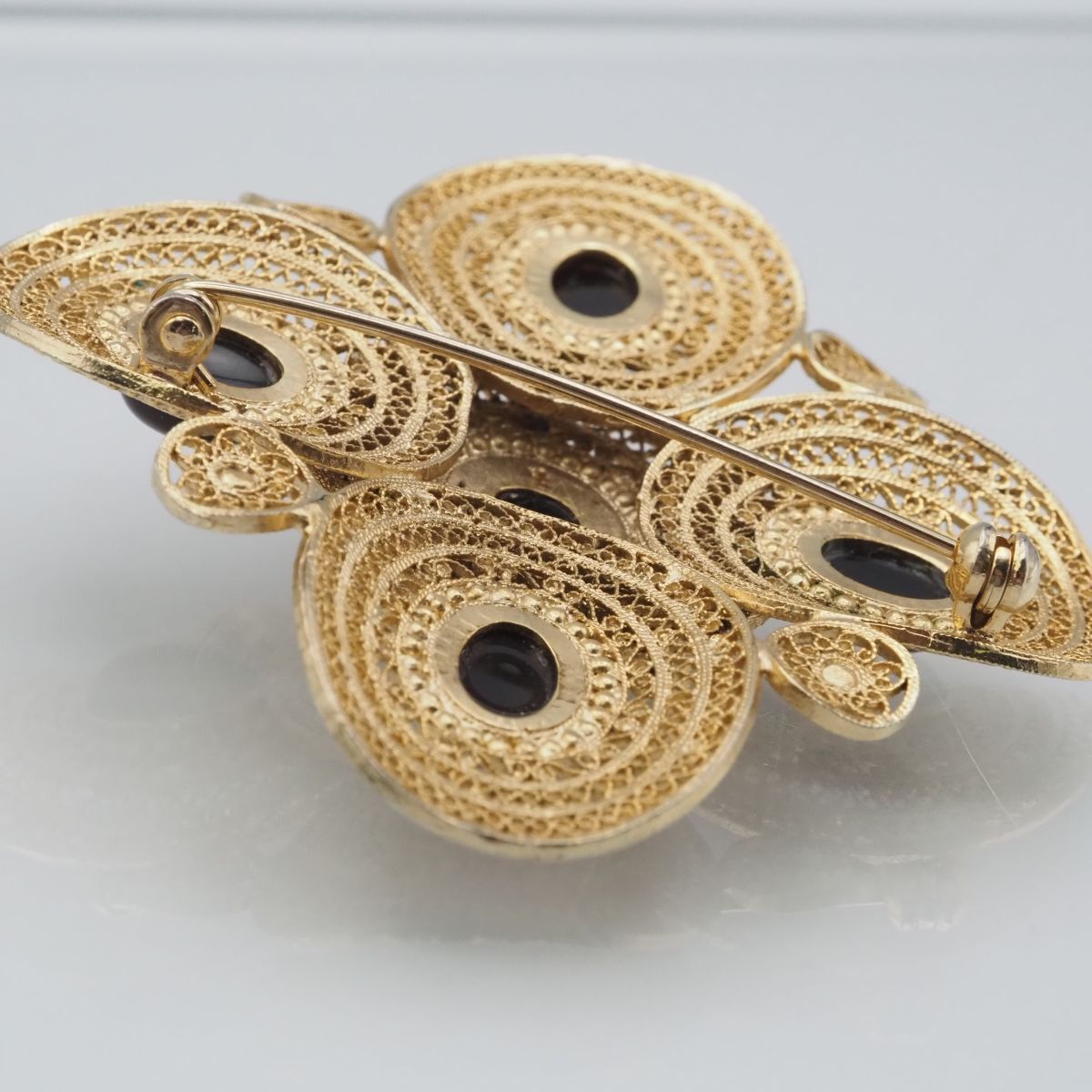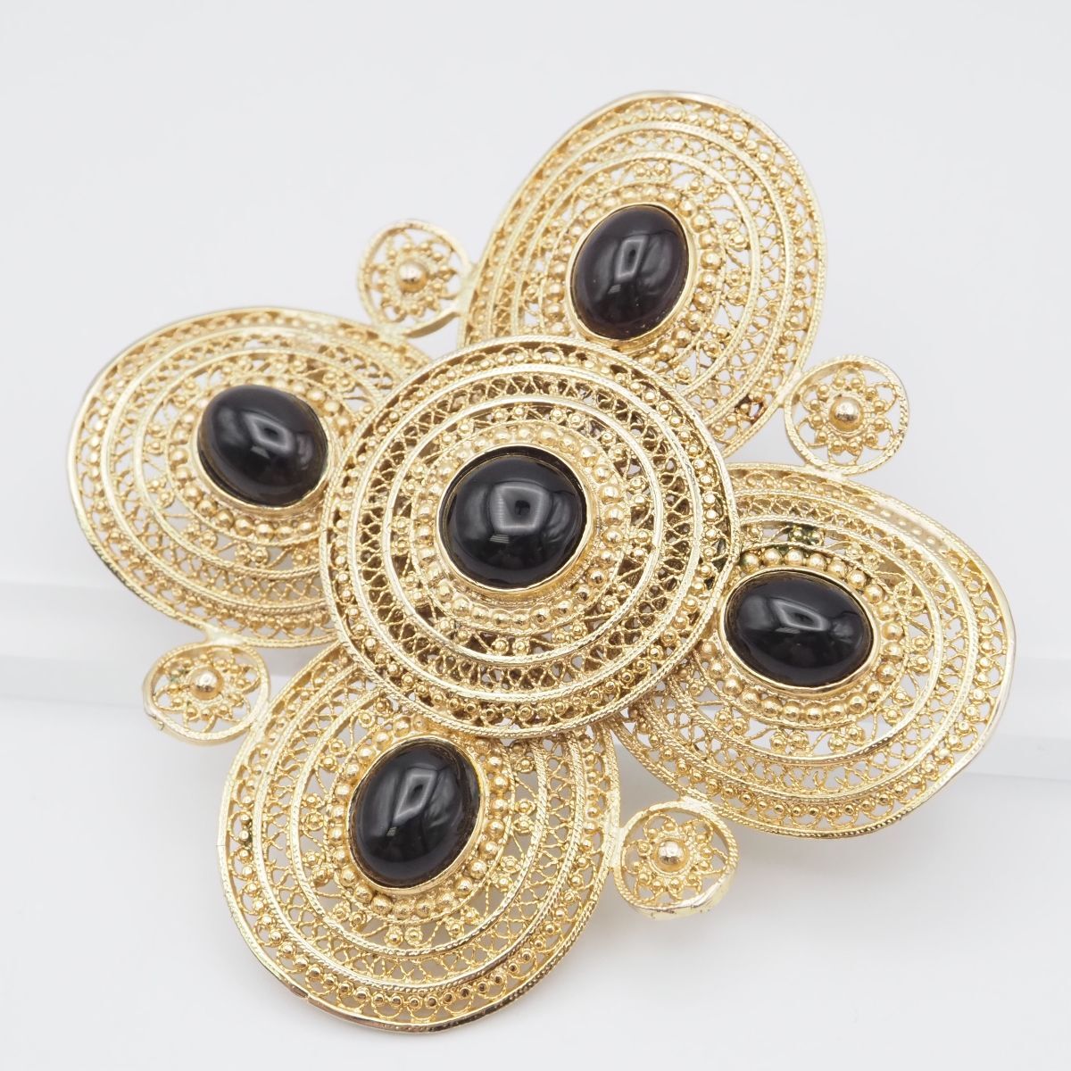 F468 ブローチ 大ぶり オニキス風 フィリグリー 銀線細工 ゴールド デザイン コスチュームジュエリー