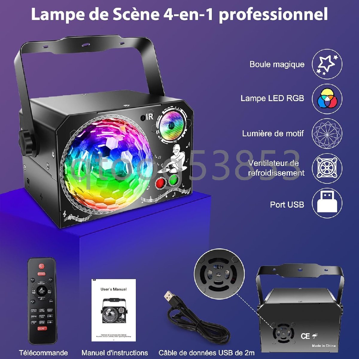4 in1ステージライト、フルディスコライト、リモコンとストロボ付き、65個のRGBとUV照明効果、USB照明ディスコミュージックボーカルコント
