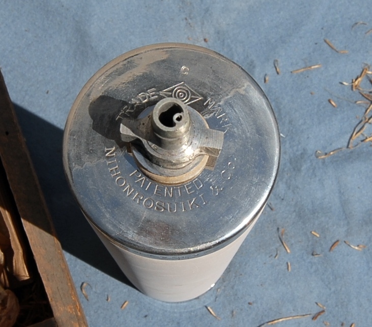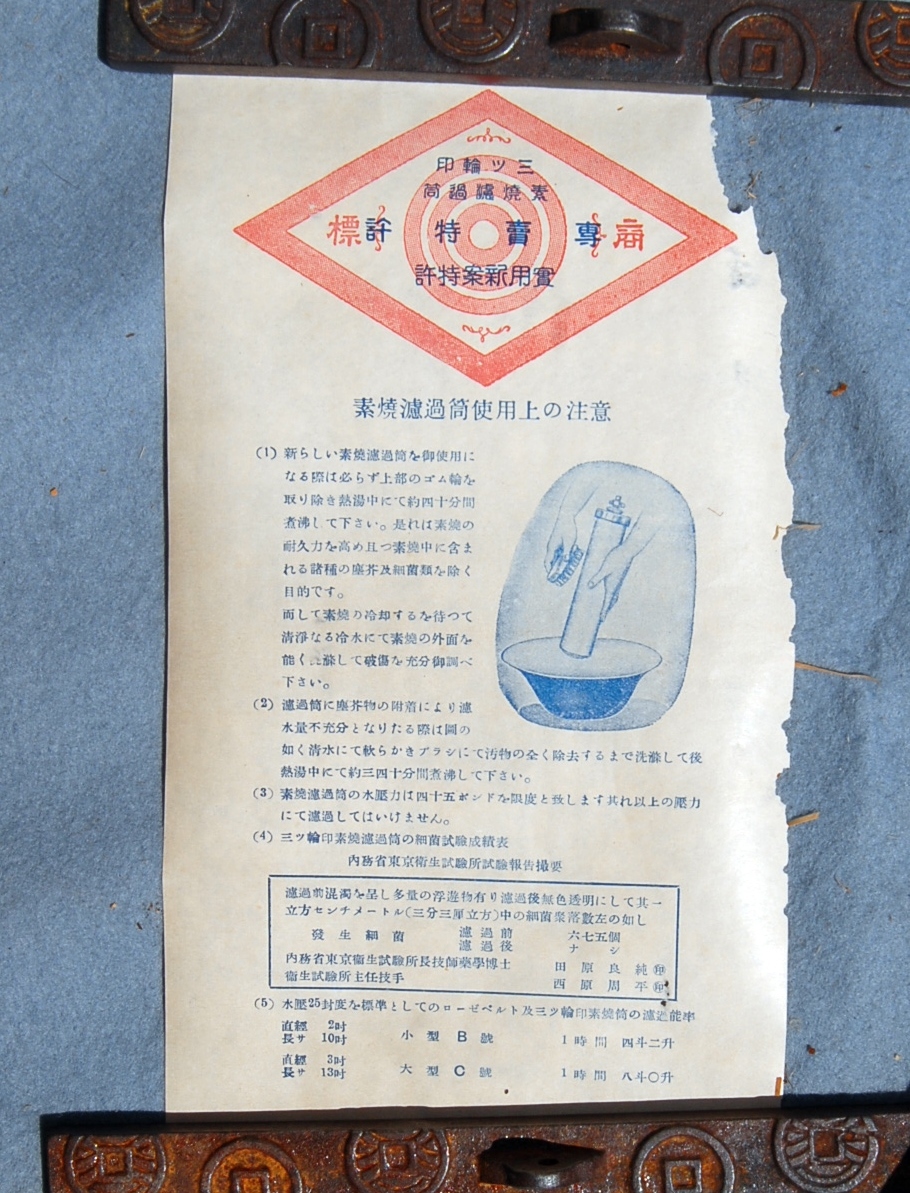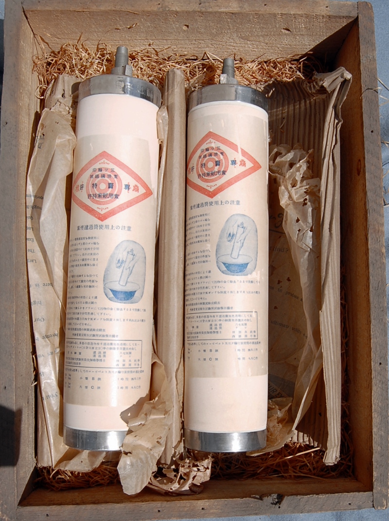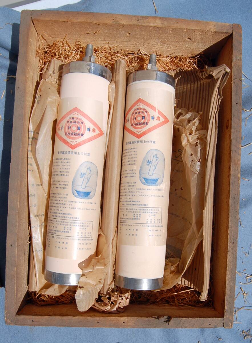 昭和初期 醸造専用 専売特許:素焼濾過筒×2本 未使用・木箱保管 三ツ輪印:日本濾水機
