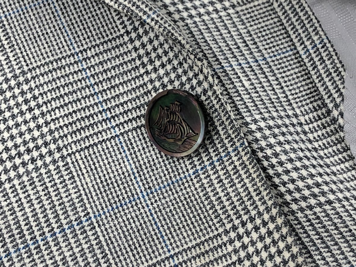 多少の着用感、多少のスレ、裏地の所々にペン汚れやシミ汚れ、ベント裏地にほつれ、所々ボタンに欠けがございます。また、所々に薄い汚れや小さなシミ汚れがございます。普通にお召いただけますが、御理解の上ご購入下さい。