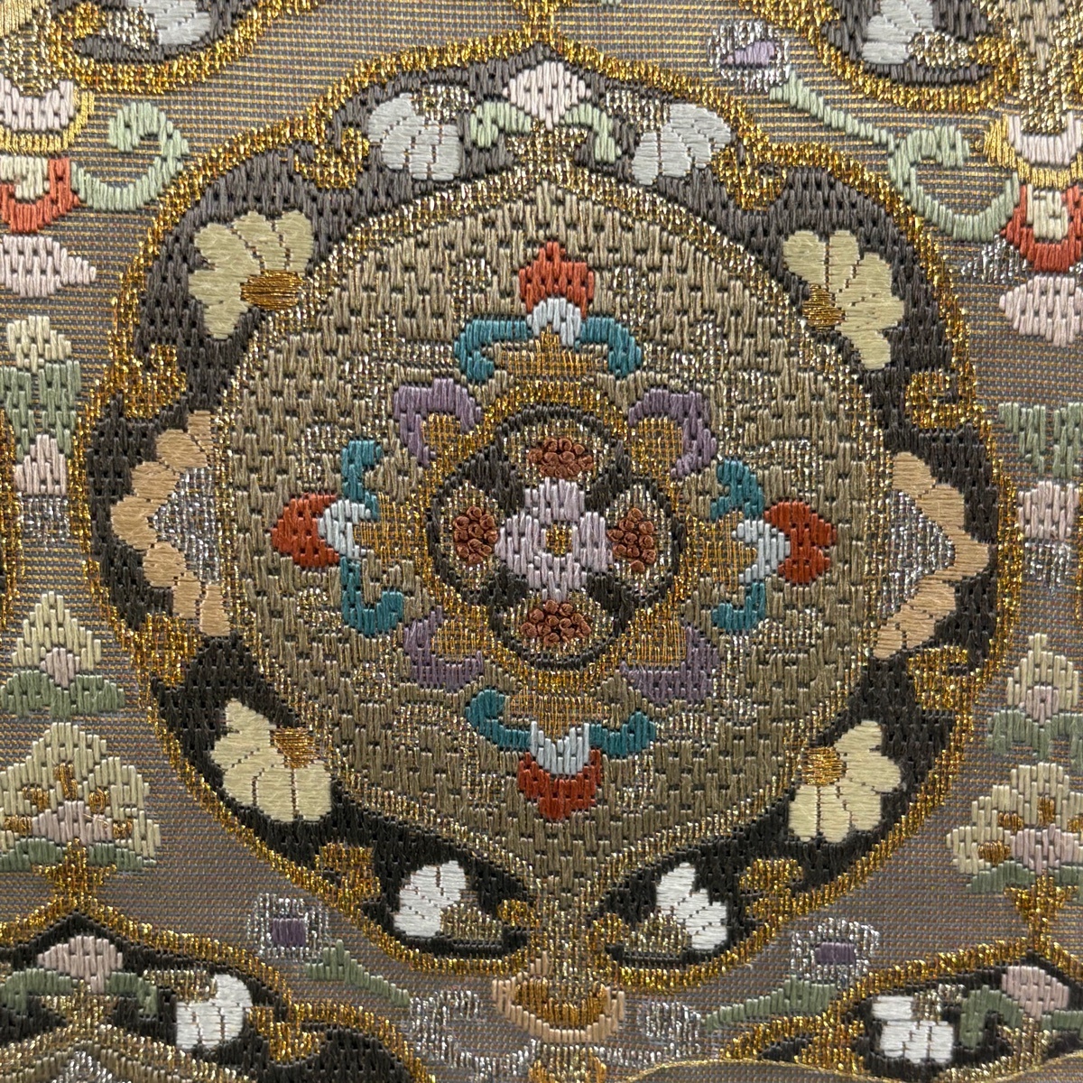 | 袋帯 名品 華文 草花 金糸 箔 金色 お太鼓柄 正絹 【中古】 |