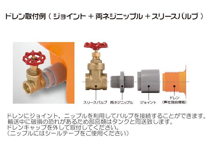 ![]() | :ドレン取付例(ジョイント+両ネジニップル+スリースバルブ) | |