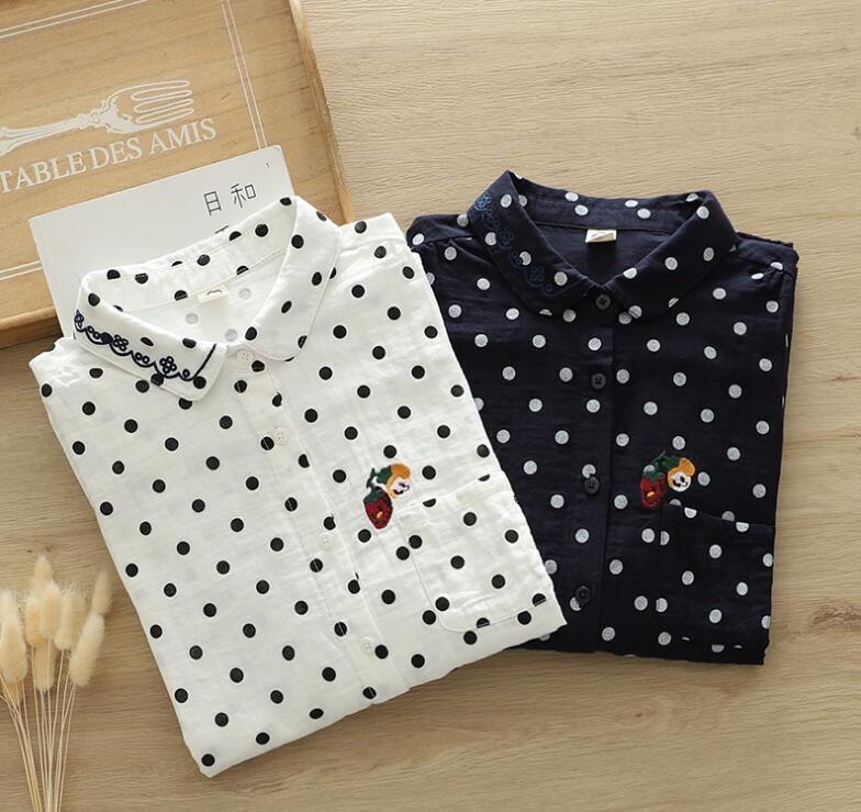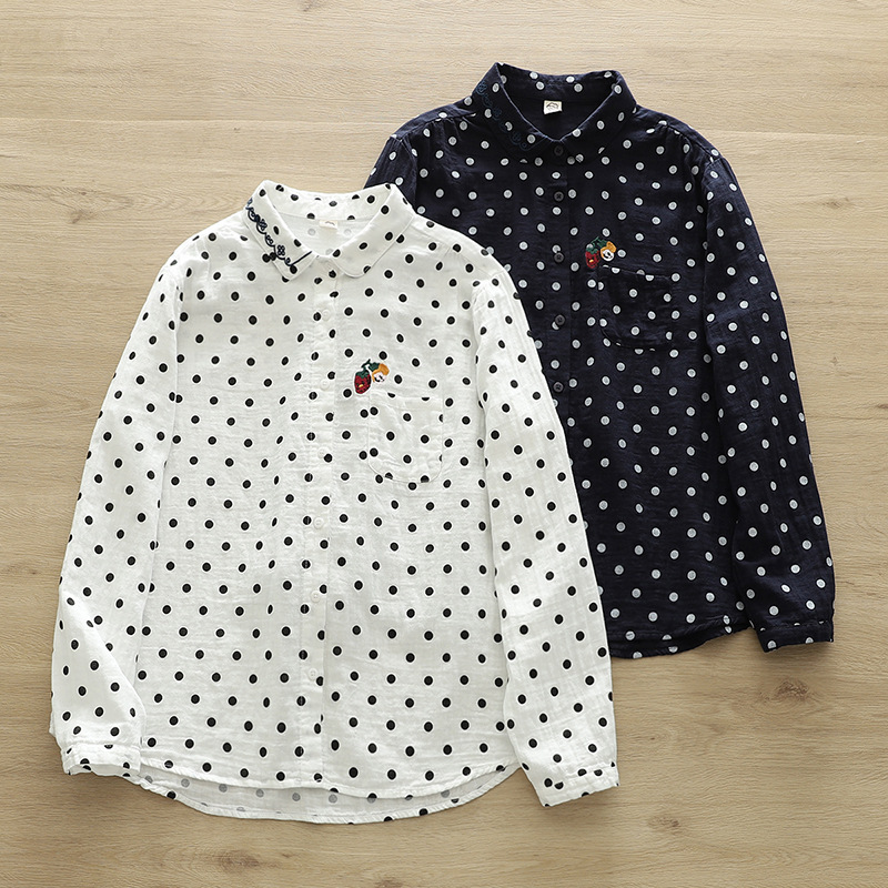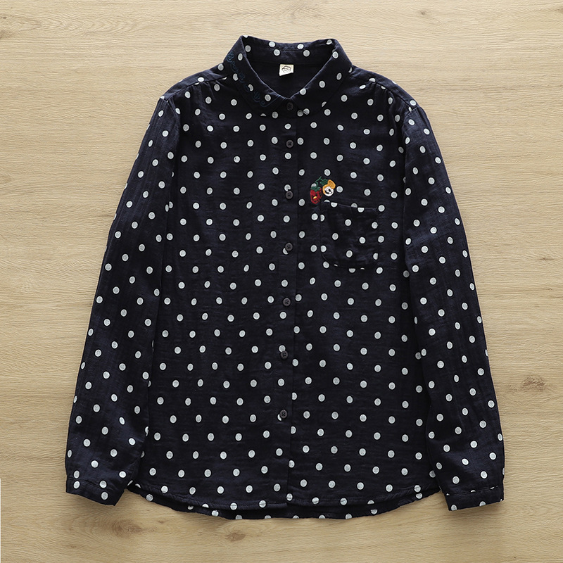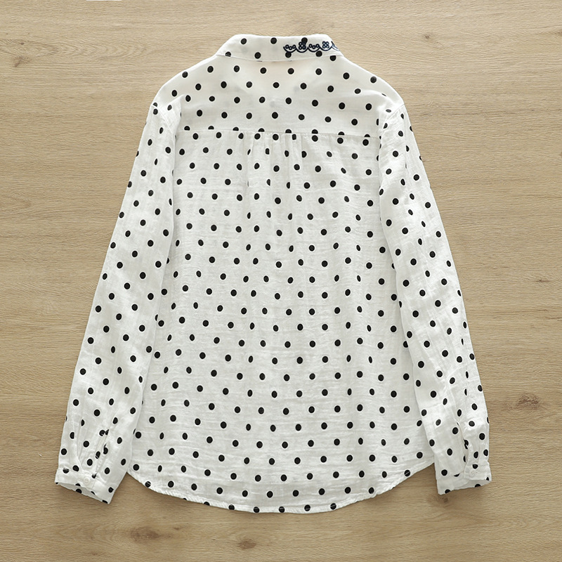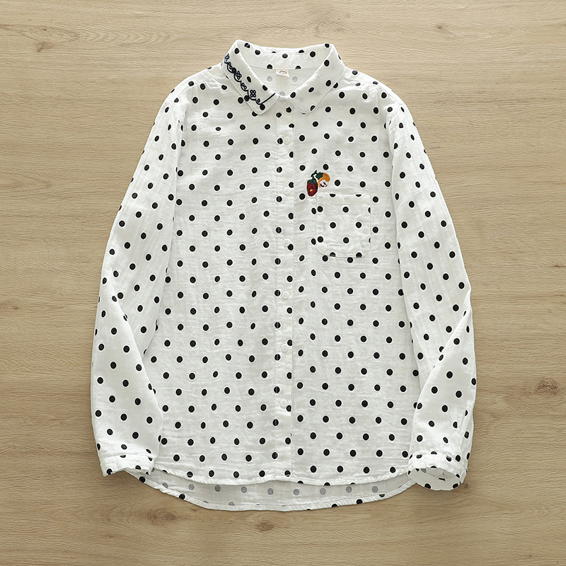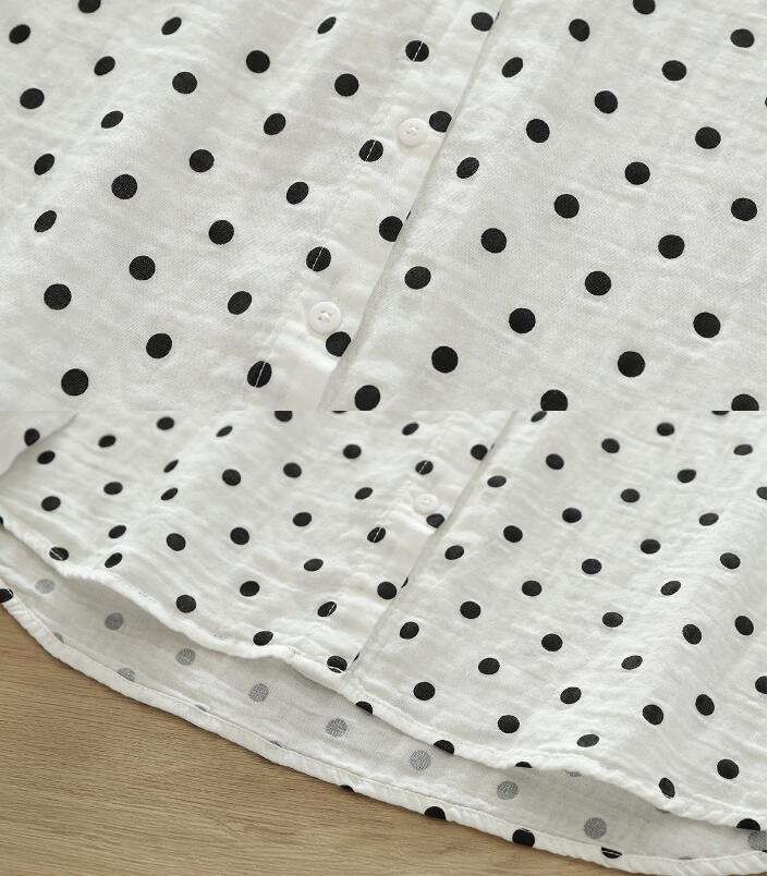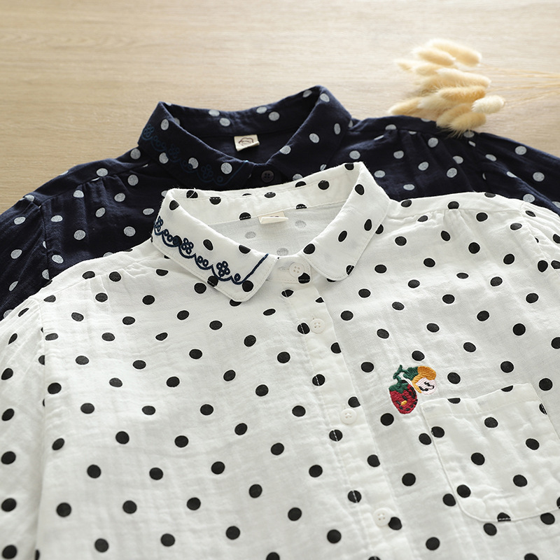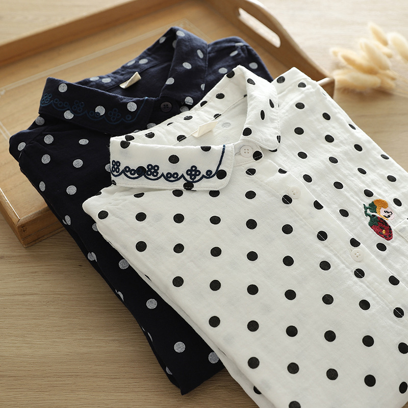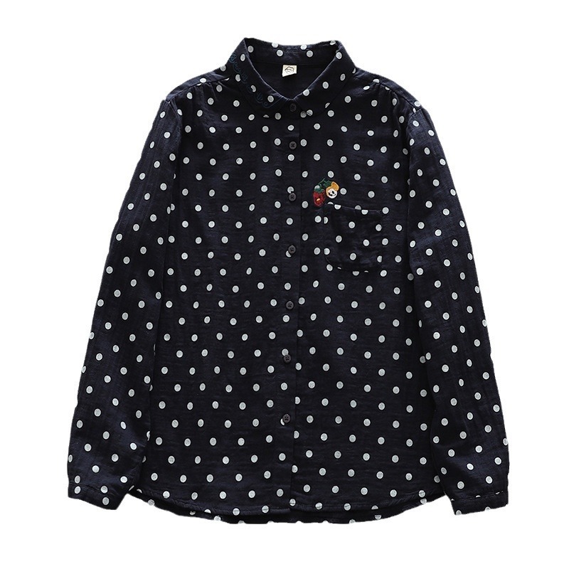 L 新作上質 レディーストップス 長袖シャツ 綿コットン可愛い 刺しゆうドット柄 ダブルガーゼ 肌触りいい 通気性いい ブラウス