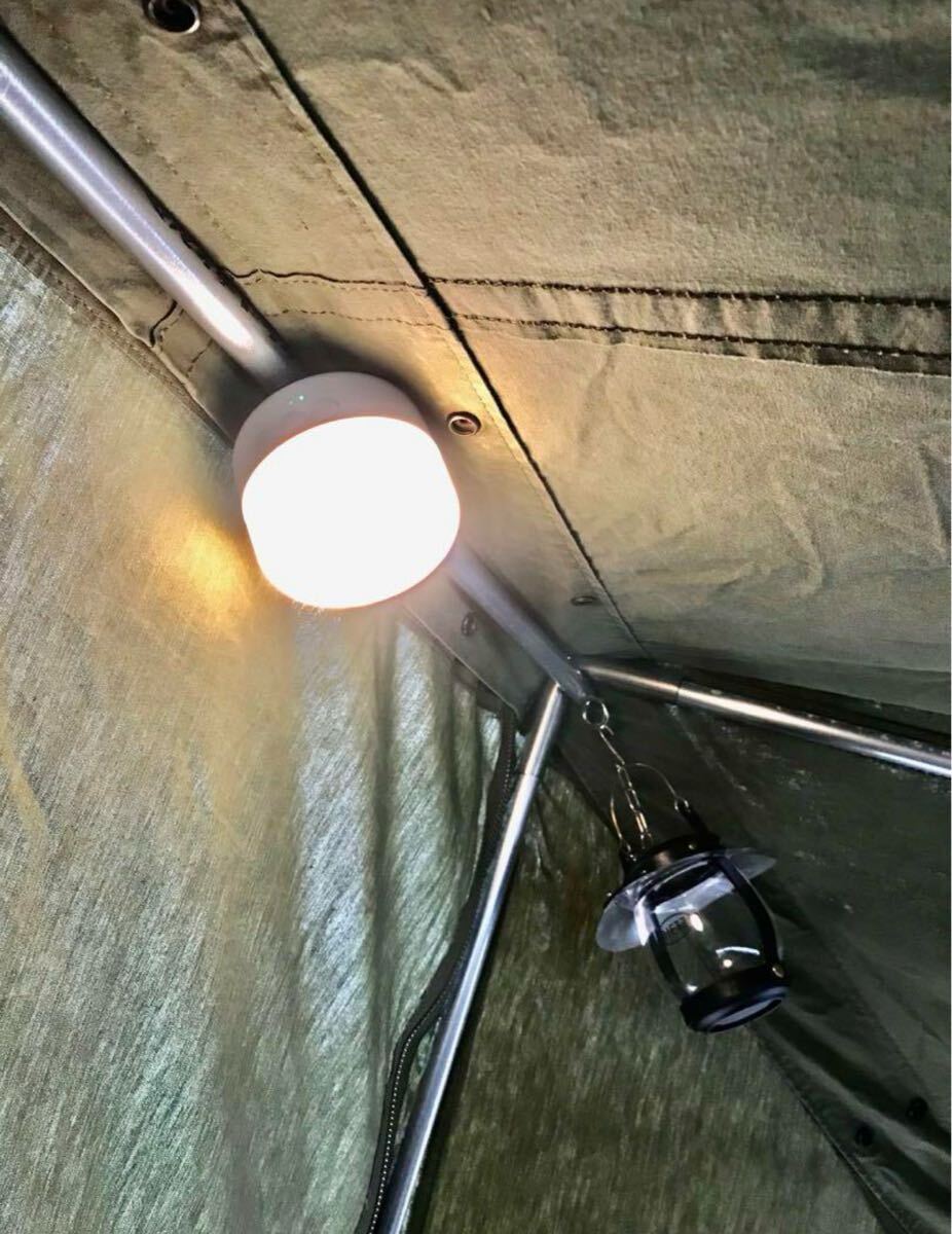 ○クランク部にはランタン・ライト・蚊帳等が吊り下げ可能。マグネット付きのライトもくっ付きます。小型ファンも挟め夏場や薪ストーブ使用時の空調管理にアジャスト。