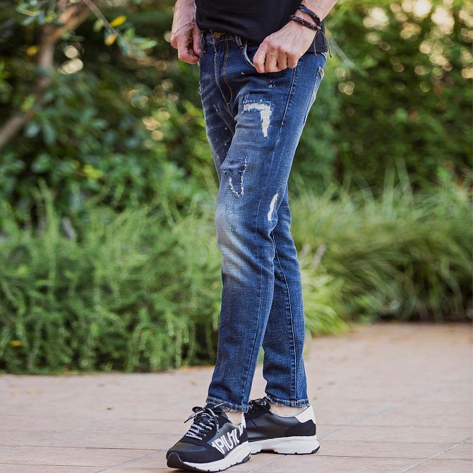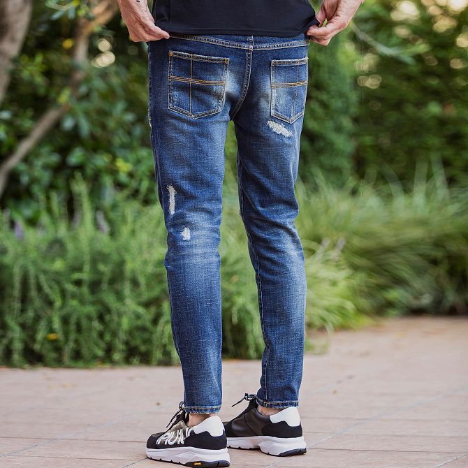 大胆なクラッシュ加工から覗くペイズリー柄がアクセントに。クロスしたバックポケットステッチが後ろ姿まで隙なく仕上げてくれます。