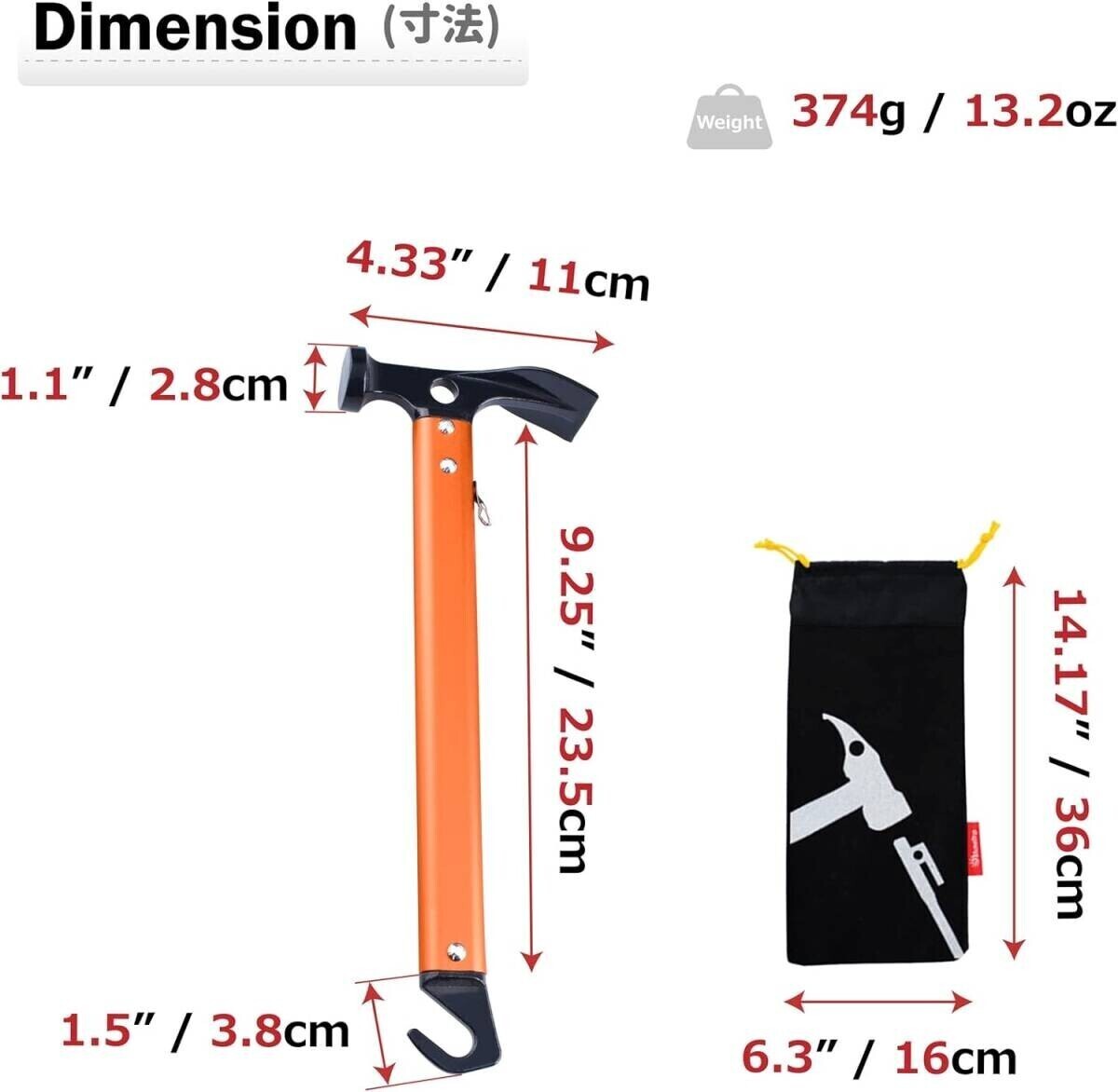【軽量】アウトドア ハンマーの柄はアルマイト加工を施したアルミニウムを採用。重量はちょっと軽めの約380gとなっています。携帯バッグ付き、コンパクトにに収納でき、持ち運びに便利です