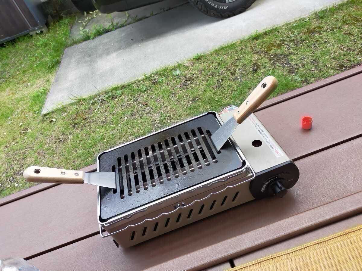 空焚きをして、鉄板全体を焼き上げていったら中性洗剤で洗います。水で洗い流したら再び火にかけ熱して水気をとり、くず野菜を焼いていきます。この野菜で臭さを吸い取り、再び水洗い。水分を蒸発させ、うすく油を塗って保管しておきましょう。