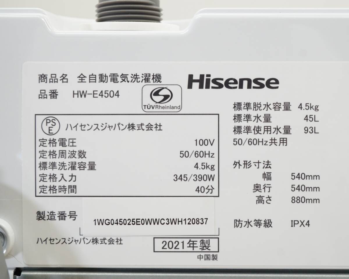 | 前ダ:【ハイセンス】全自動洗濯機 4.5kg HW-E4504 2021年 水流シャワー 洗濯板式ステンレス槽 ★送料無料★ |