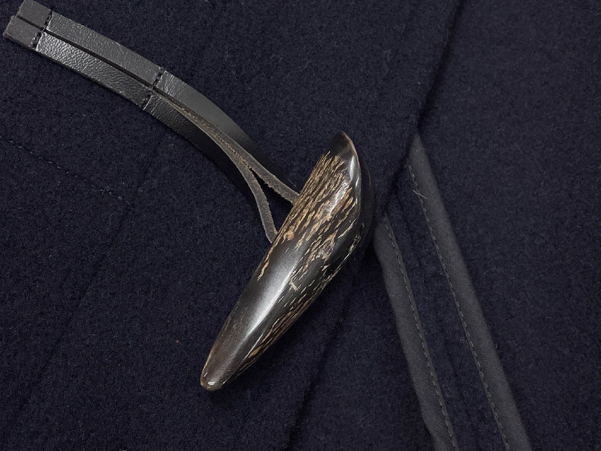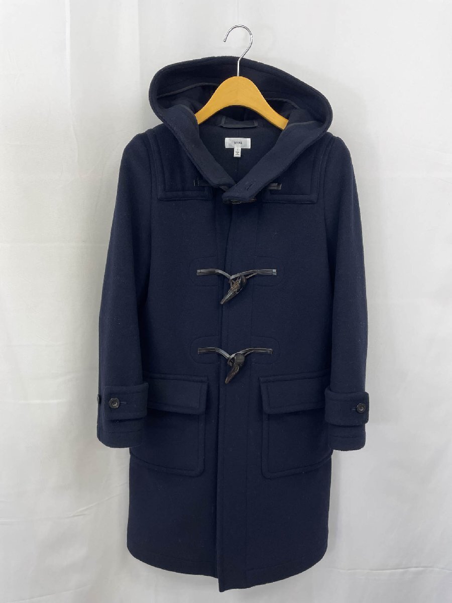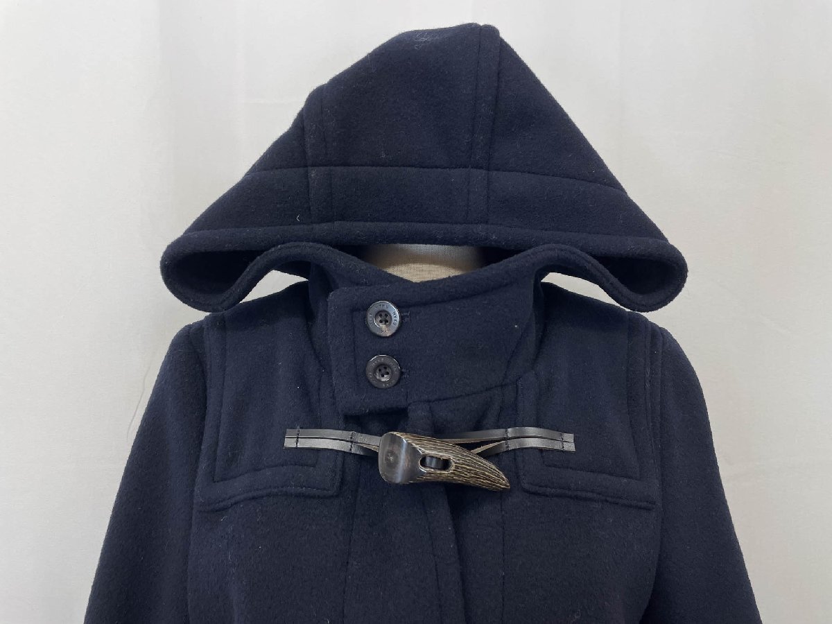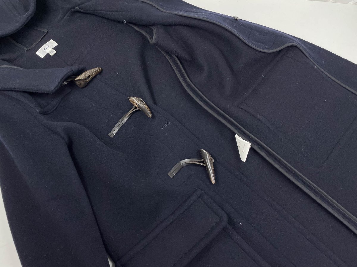 ・全体は肉厚な生地感のフード付きダッフルコートです。