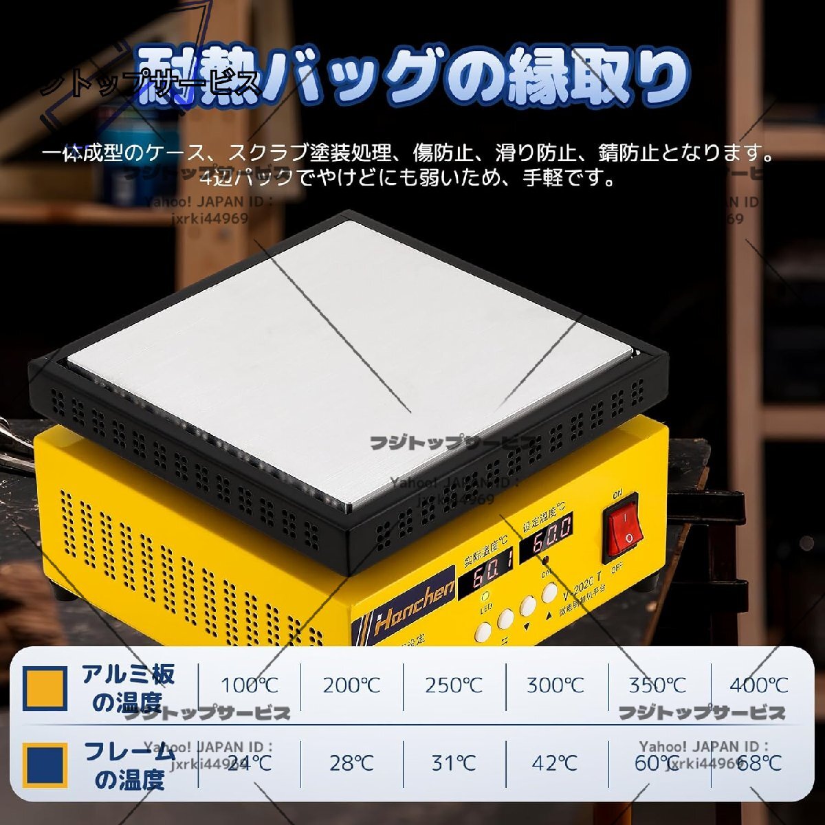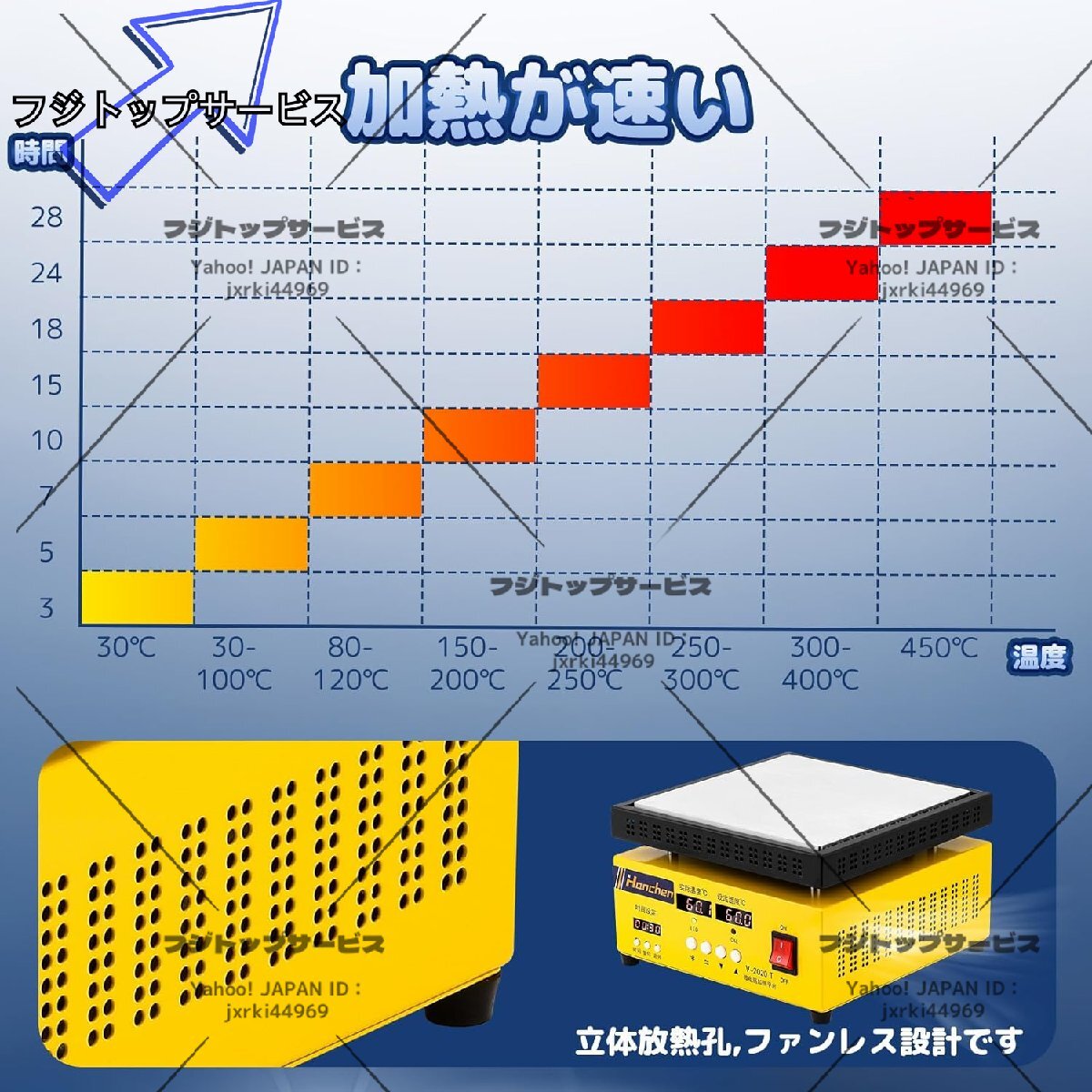 【幅広い用途】室温から400℃まで、わずか24分で昇温。液体の加熱、試薬の加熱、スマートフォン修理、回路基板の予熱、はんだ付け、金型の予熱、金属の予熱などに使用できます。頻繁に使用する場合は、複数の台を交互に使用しましょう。そうすることで、機器の寿命を長くすることができます