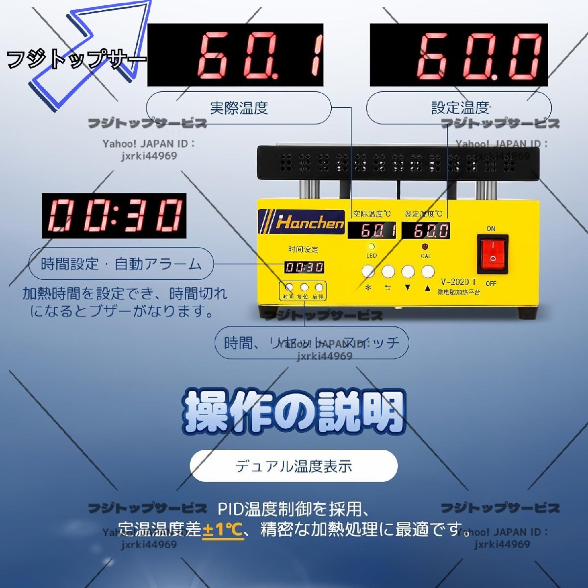 【高精度温度制御】PID温度制御を採用し、温度誤差は1℃以内、精密加熱処理に適しています。設定温度と実際温度の2つのディスプレイは、いつでも調整可能です。加熱台使用完了後は、自然に冷却させてください。他の工具を使って冷却しないでください。