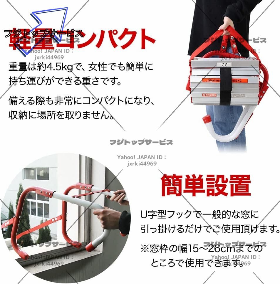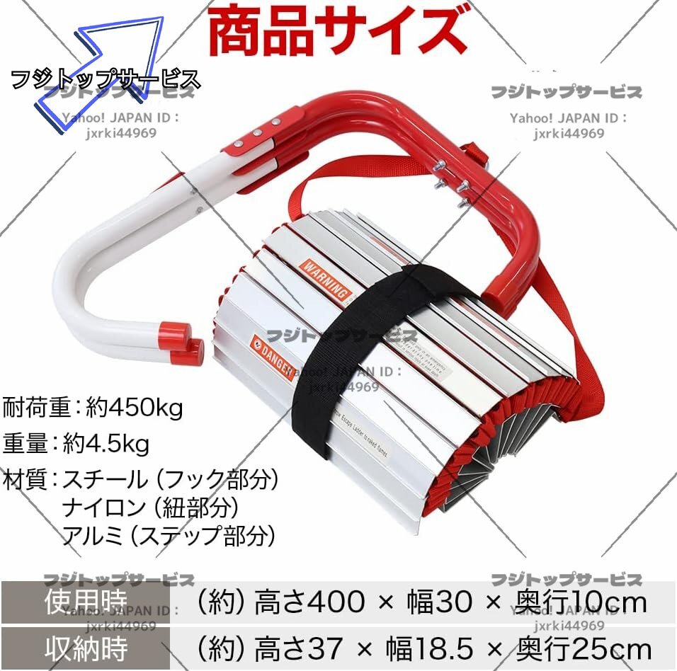 【商品詳細】 使用時サイズ:約(H)400×(W)30×(D)10cm 収納時サイズ:約(H)37×(W)18.5×(D)25cm 最大荷重:(約)450kg 重量:(約)4.5kg 材質:スチール(フック部分)・ナイロン(紐部分)・アルミ(ステップ部分) ※こちらの商品は一般家庭用緊急時避難梯子です。 消防法による消防用設備の設置義務にはご使用いただけません。