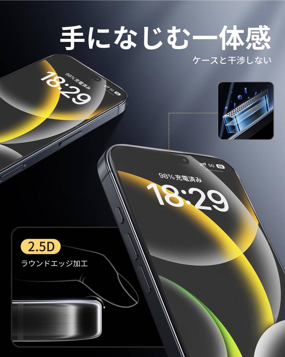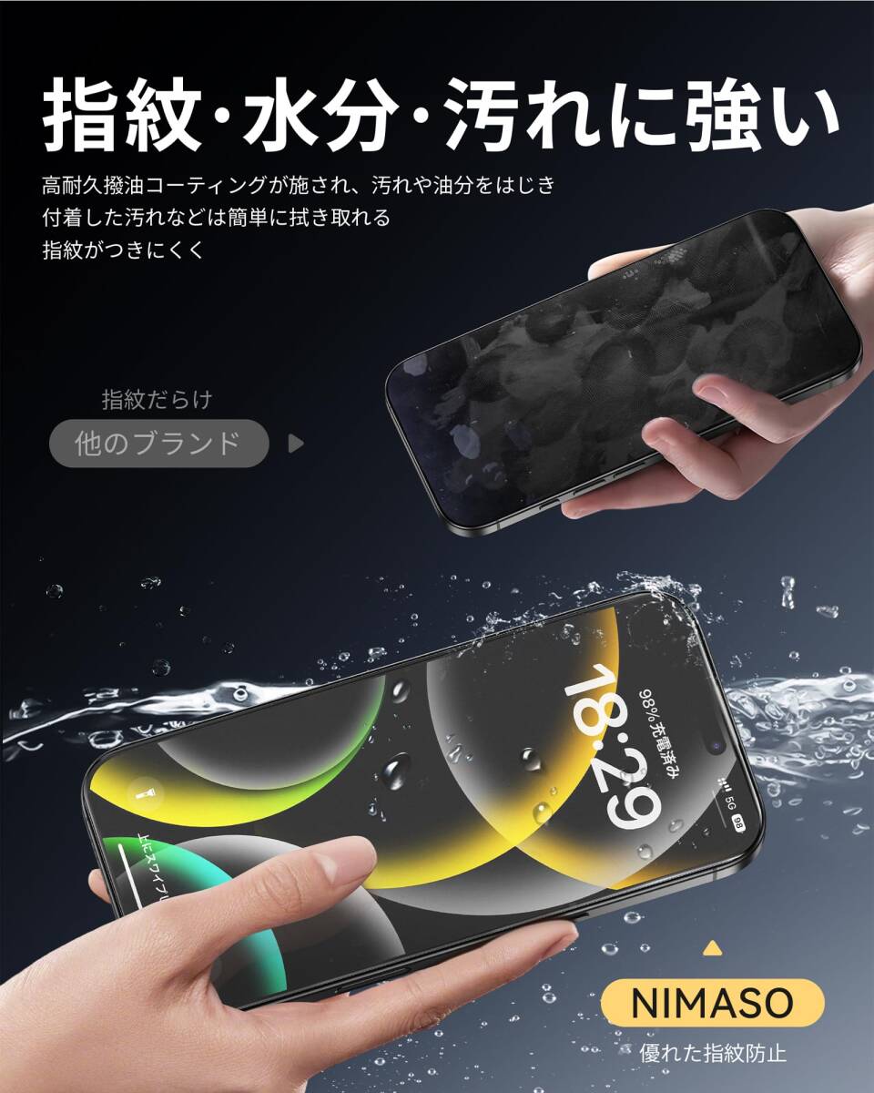 「指紋防止・なめらかなタッチ感度」本製品は撥水撥油のAF(Anti-Fingerprint)コーティング加工とスムーズタッチ加工により、指紋や汚れがつきにくく、油分や水分が多く含む汚れや指紋がついても、拭き取るだけで綺麗になります。また、使用時の手触りも滑らかで、動画視聴や仕事中の作業、ゲームなどの邪魔になりません。常に美しいアイフォン16プロの画面をお楽しみいただけます。