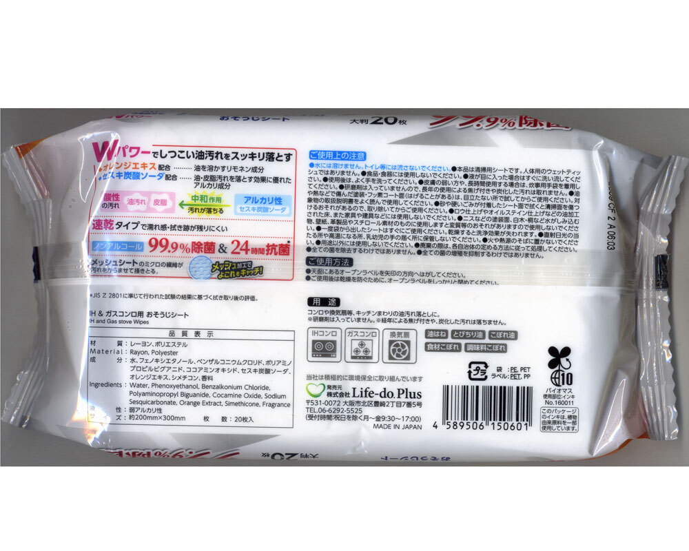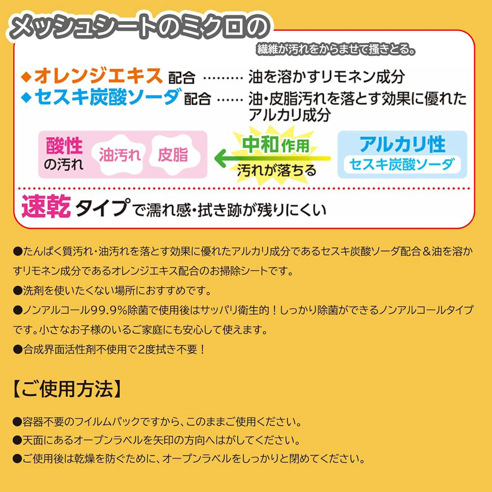 ・特徴セスキ炭酸ソーダとオレンジエキスのダブルパワーでIHコンロやガスコンロのガンコな油汚れもするんと落とすおそうじシートです。