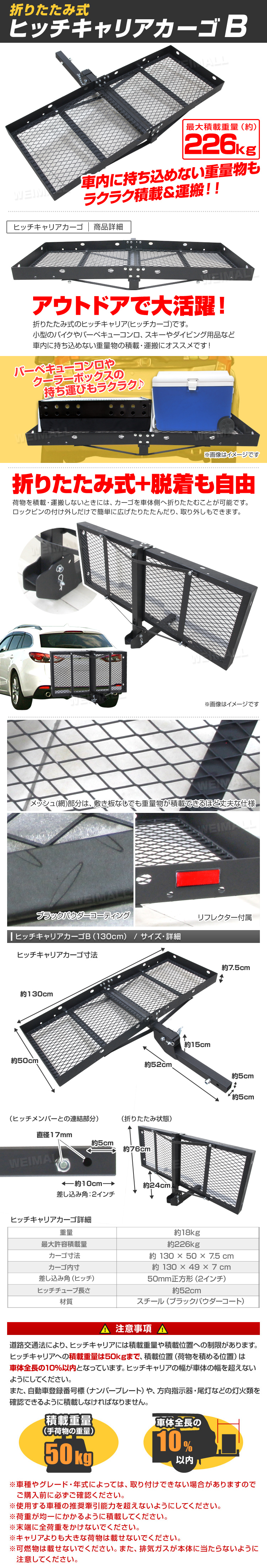 WEIMALL ヒッチキャリアカーゴ 汚れ物等の車内に積むには厳しい物を積むのに便利なヒッチキャリアカーゴ! 荷台サイズ(約):幅130×奥行き50×厚さ7.5cm 最大許容積載量(約):226kg |