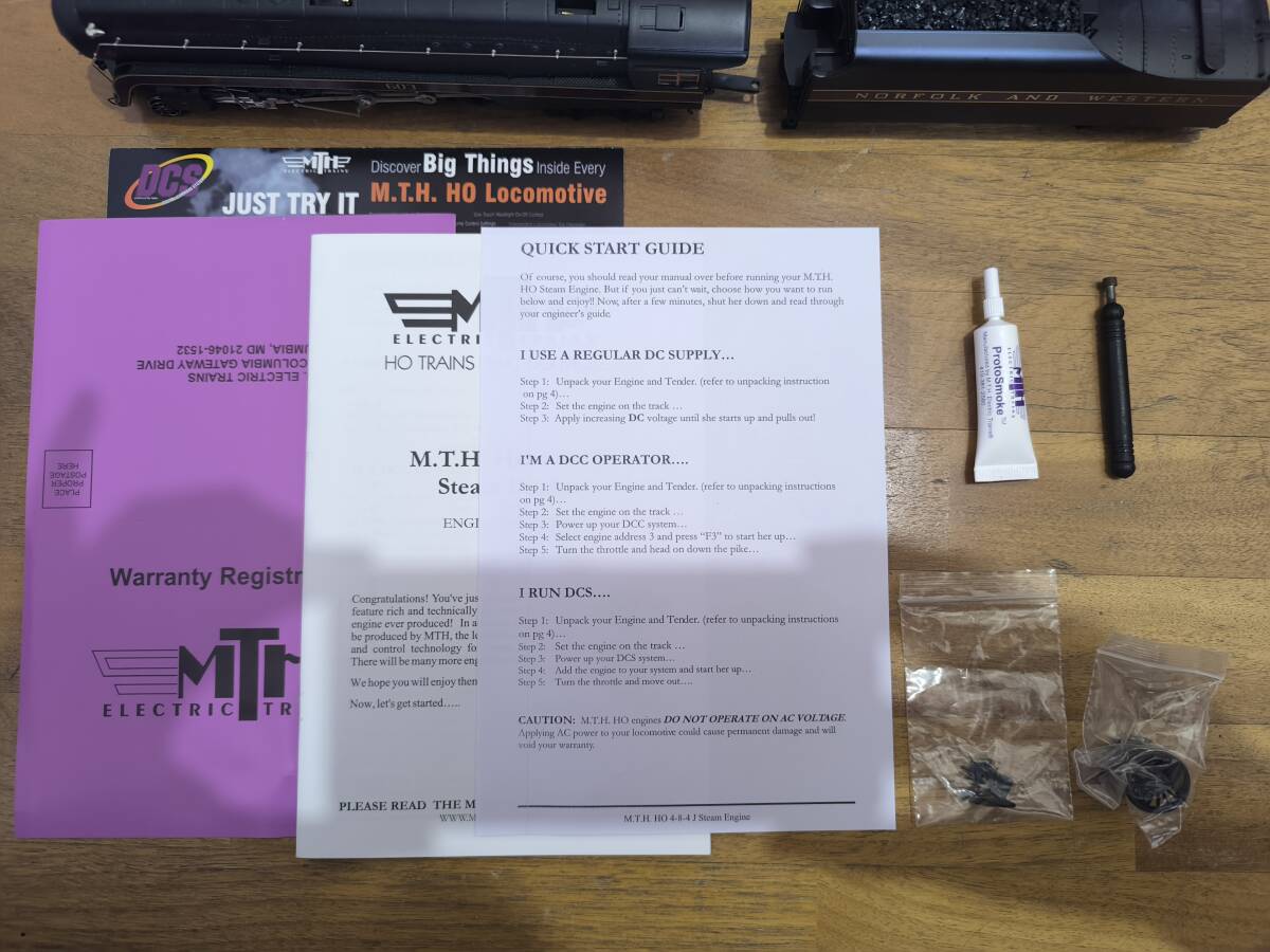 付属品は、箱、マニュアル、クイックスタートガイド、保証書?、前部?カプラー、交換用?動輪、ロッドを外す工具、発煙剤です。