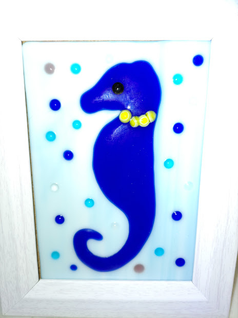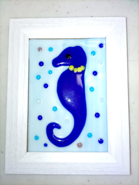 カラー:背景は水色、タツノオトシゴは青色のガラス。