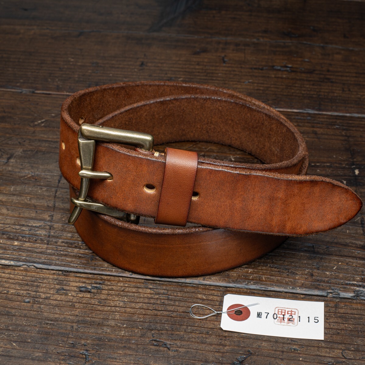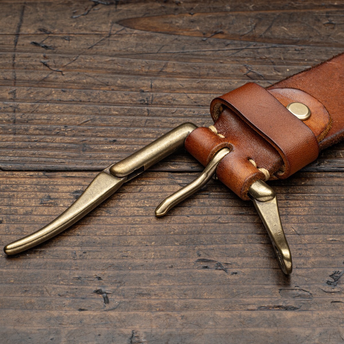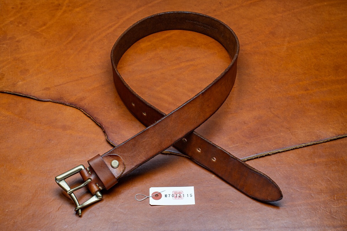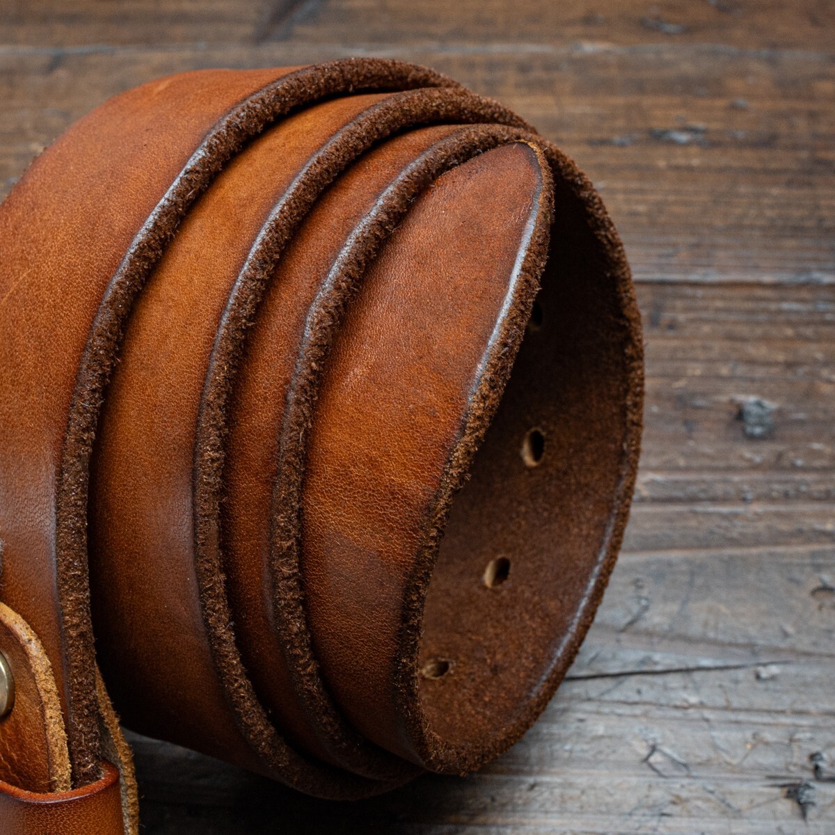 ベルト本体には繊維が密に詰まったステアハイドを一般的な倍近い厚みで使い、引き裂きや伸びに強い耐久性を実現。仕上げは耐久性を重視し、革の質感を生かした無骨な表情で、使うほどに艶と深みが増し、ビンテージのような風合いが出てきます。断面は丁寧に磨き上げられており、劣化を防いで長く使えます。
