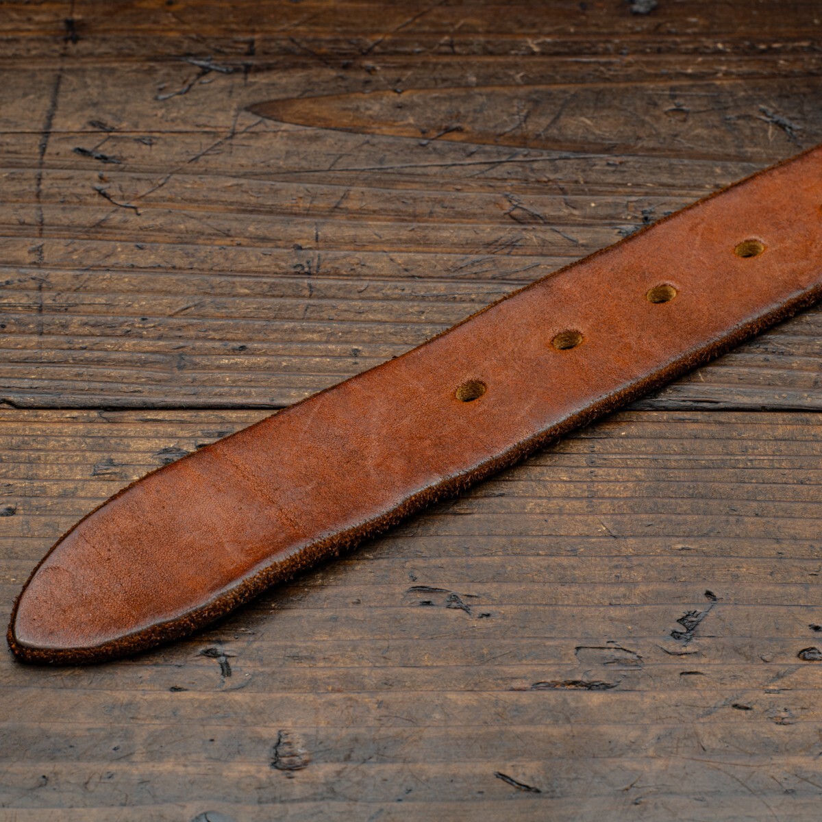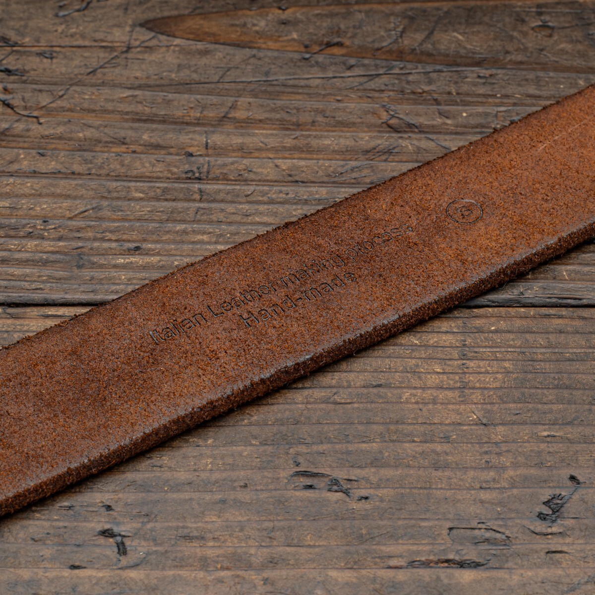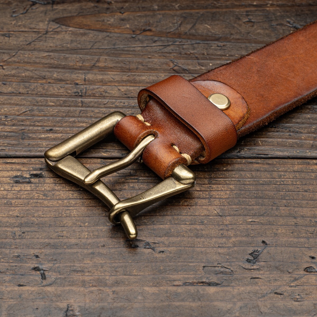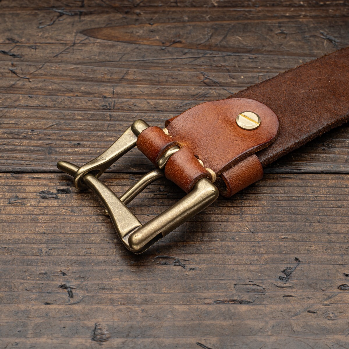ベルト本体には繊維が密に詰まったステアハイドを一般的な倍近い厚みで使い、引き裂きや伸びに強い耐久性を実現。仕上げは耐久性を重視し、革の質感を生かした無骨な表情で、使うほどに艶と深みが増し、ビンテージのような風合いが出てきます。断面は丁寧に磨き上げられており、劣化を防いで長く使えます。