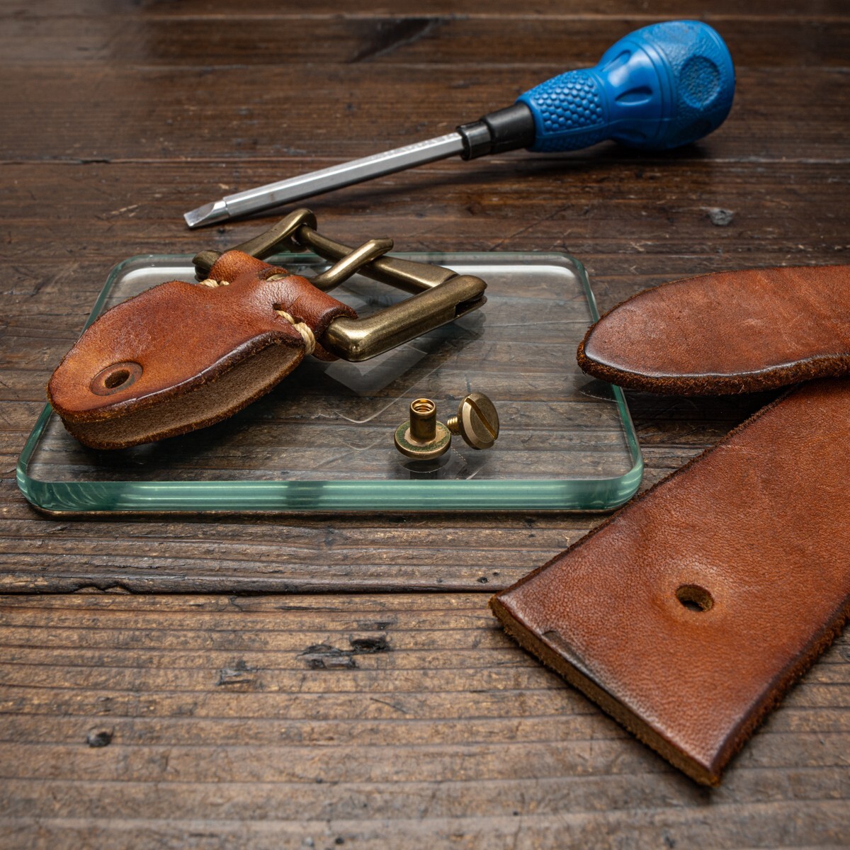 バックル裏のネジ金具をマイナスドライバーで外し、ベルトを好みの長さにカットしたあと、革用錐でネジ穴を開けて、再度金具を締め直してください。