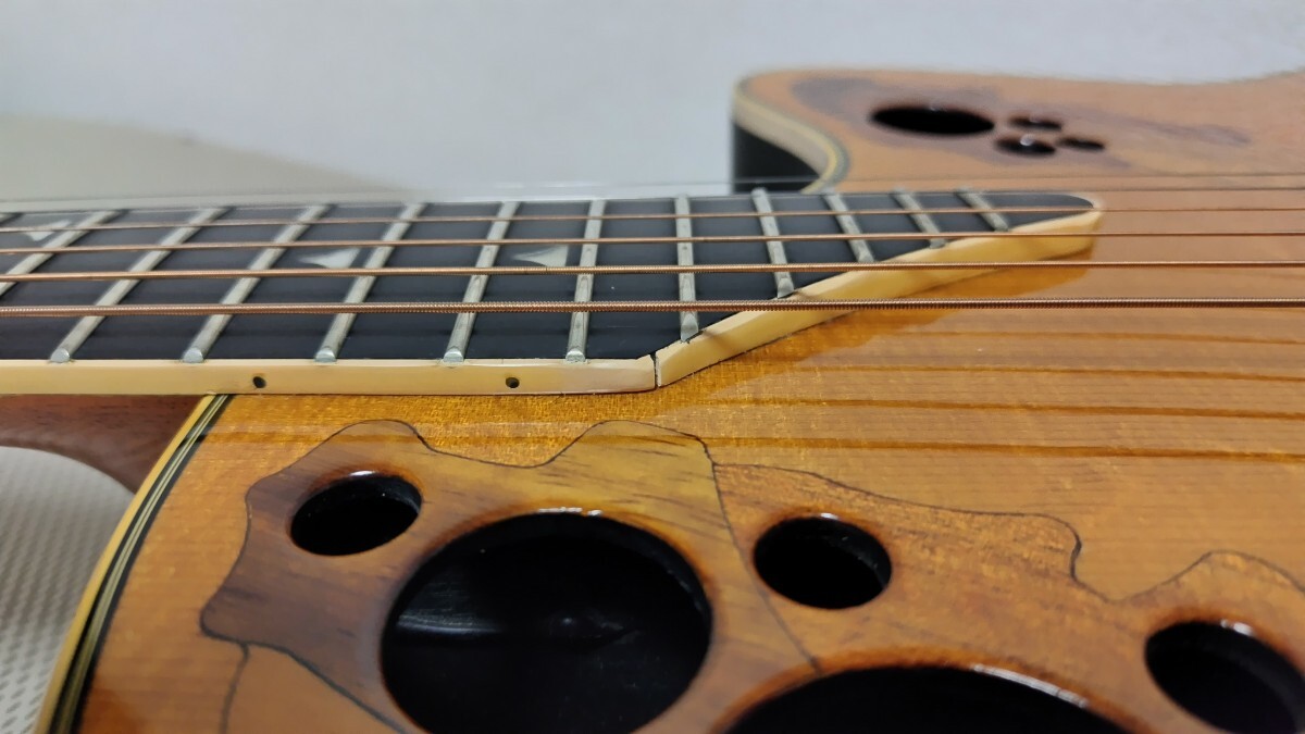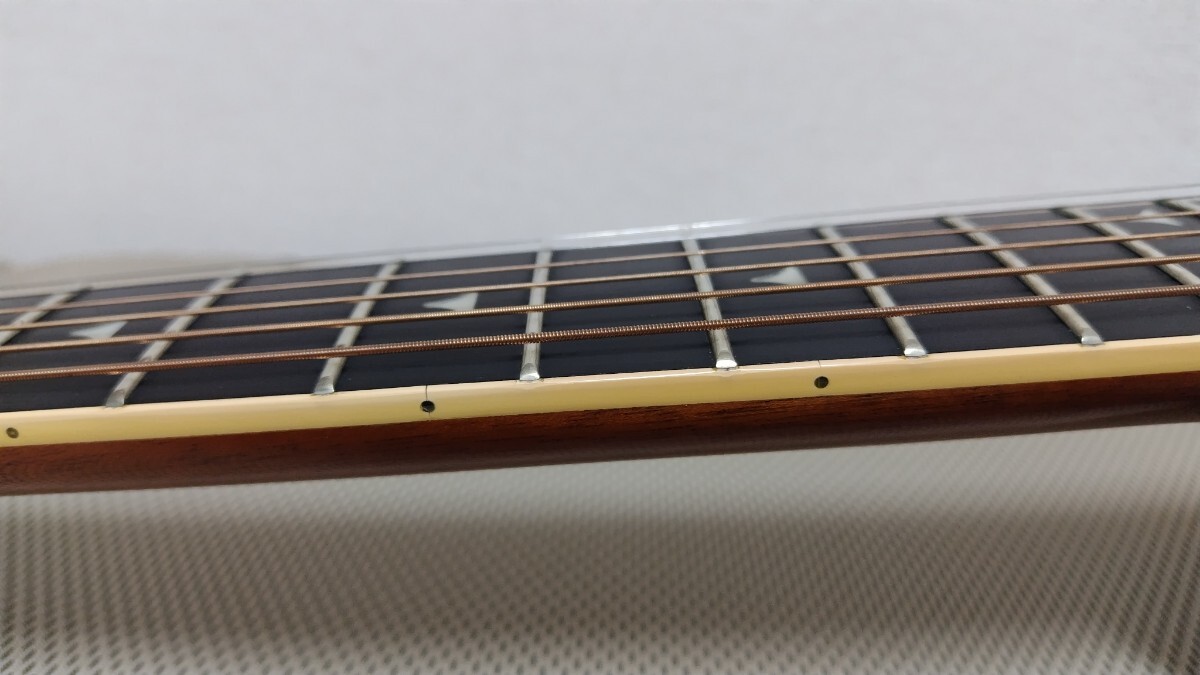 ・写真7,8 指板エンド、5,7フレット付近にバインディングのヒビがあります。演奏性には問題ありません。