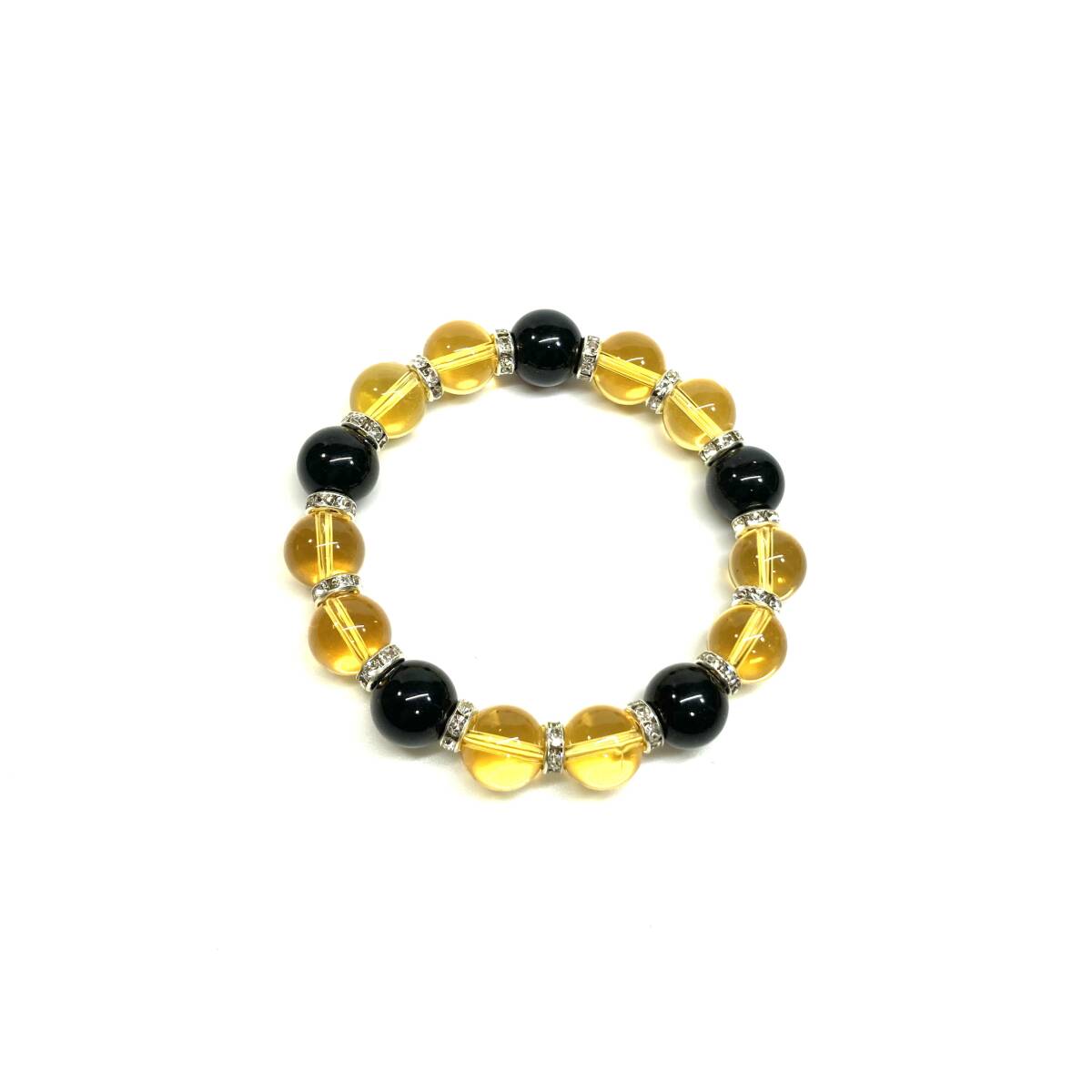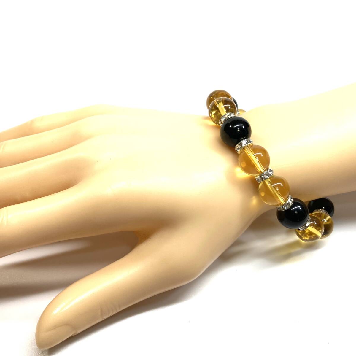 こちらは、オニキスとシトリンを組み合わせたパワーストーンブレスレットです。間にはロンデルを挟み高級感あるデザインに仕上げております。石大きさは12mm玉を使用して内周約18cmです。気になる方は是非この機会にどうぞ。