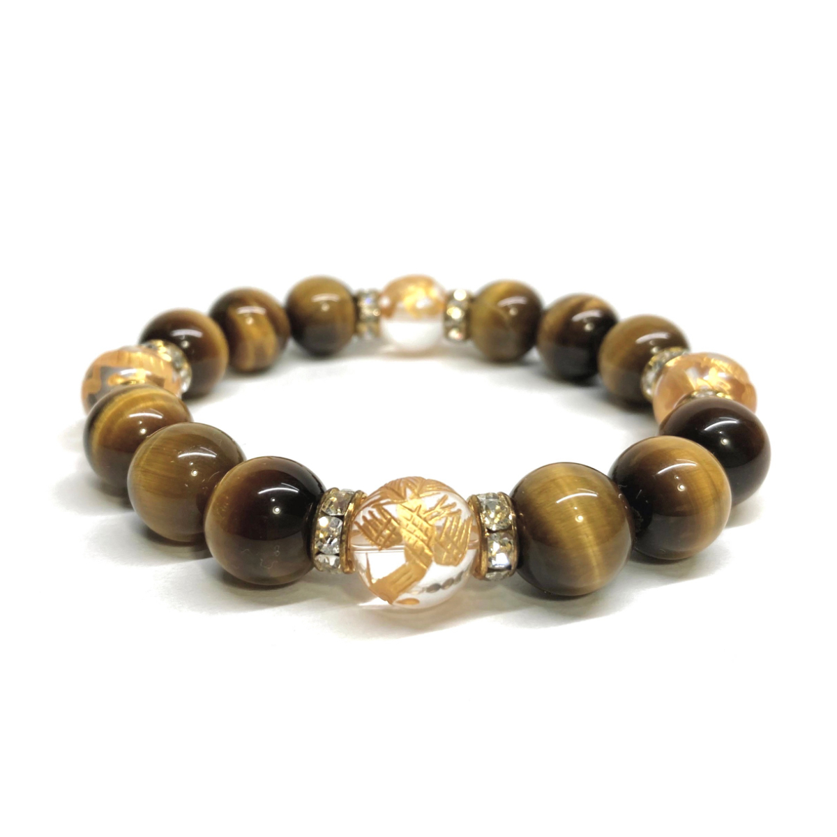 こちらは、四神獣金彫水晶とタイガーアイを組み合わせたパワーストーンブレスレットです。四神獣は、中国の伝説で4つの方向(東西南北)を守護する神聖な神。四神獣、厄災から身を守り、多くの運気を呼び込むと言われております。石大きさは程よくインパクトのある12mm玉で内周 約17cmです。 数に限りがございますので気になる方はお早めにどうぞ。