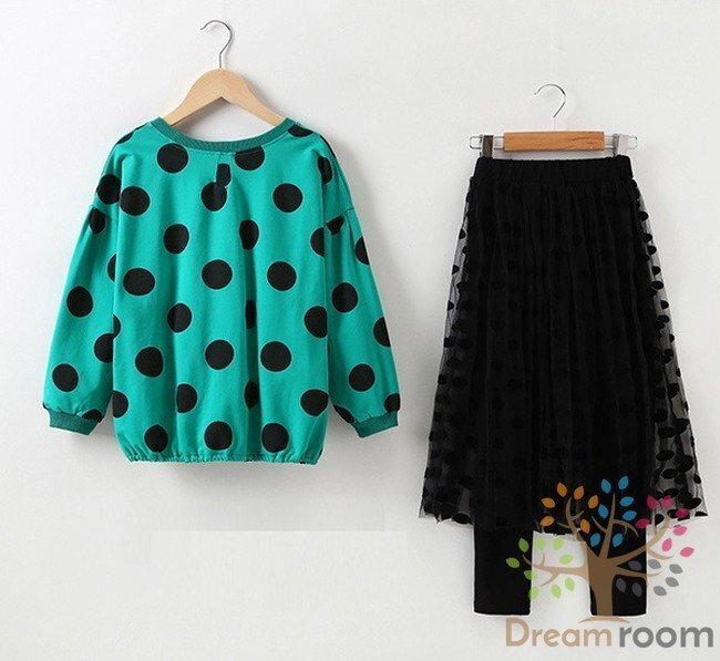 1スタ☆【110cm】グリーン ドット柄tops&シフォンチュールフレアスカート セットアップ 子供服 女の子 韓国子供服