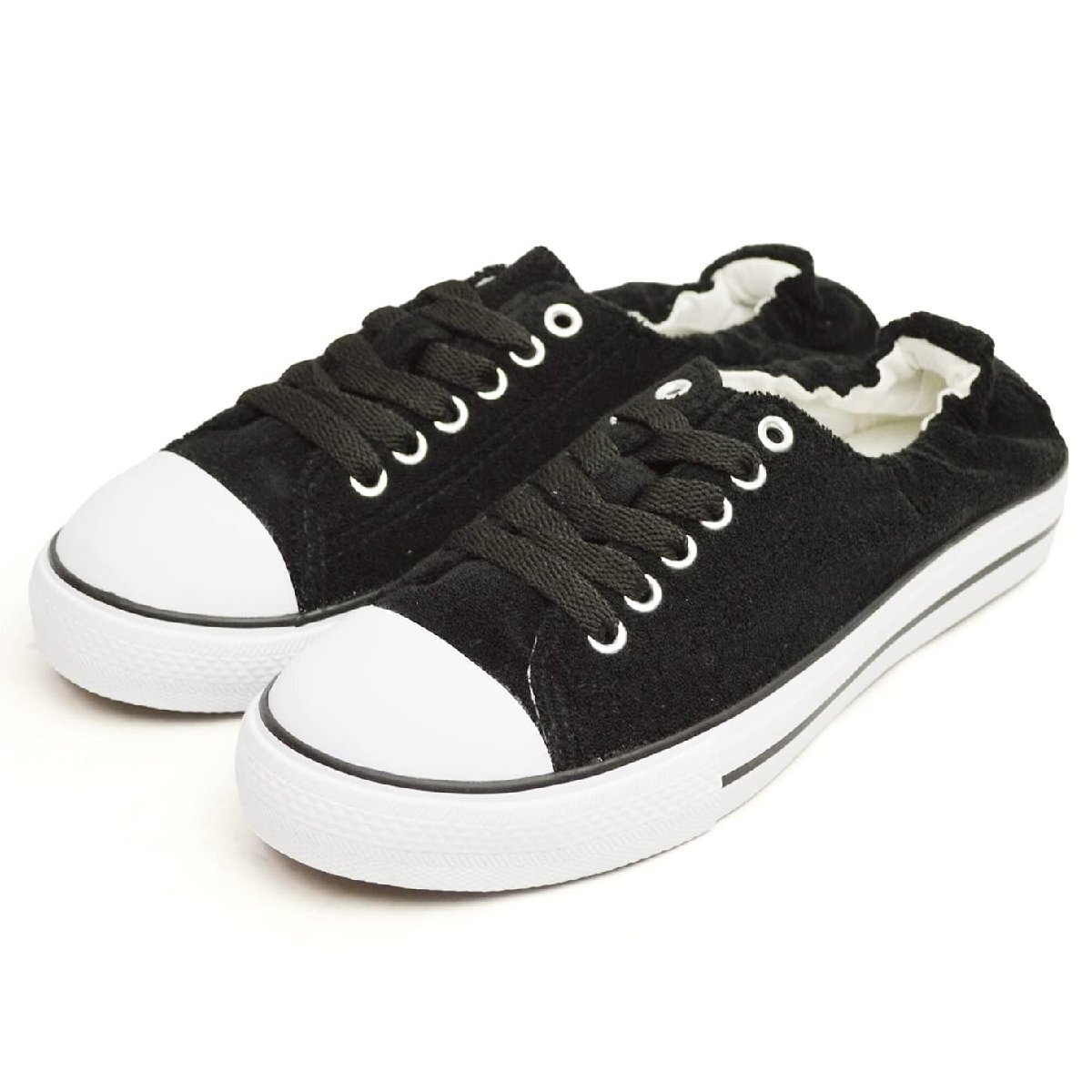 レディース スニーカー シンプル 紐靴 ローカット フラットシューズ 軽量 カジュアル くしゅくしゅ ギャザー ゴム パイル生地 7737