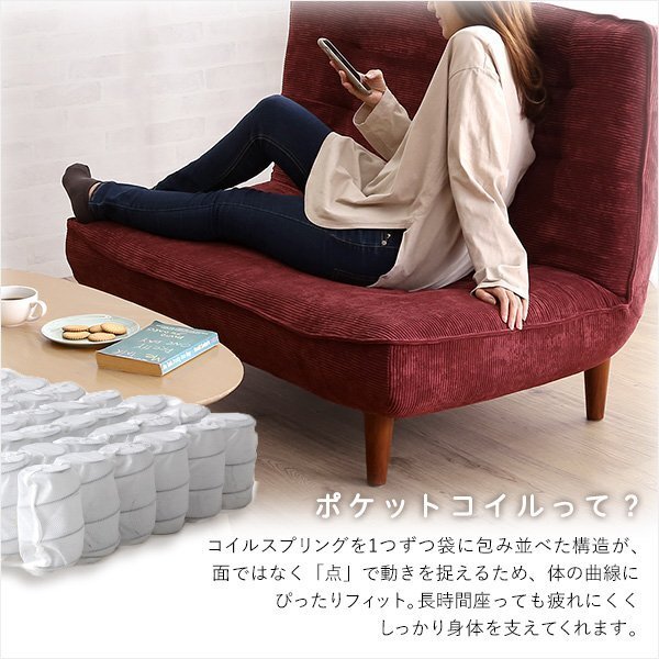 | ハイバックの2人掛けリクライニングコーデュロイソファ。 日本製ギア搭載で背もたれの角度を3段階に軽く調節できるソファです。 張地は肌触りがやさしいコーデュロイ生地。温かみのあるカラーが、お部屋をお洒落に彩ります。 2人掛けのワイドシートはポケットコイル仕様で、体を点で支え、長時間でも疲れにくい快適な座り心地です。 脚を外せばロータイプソファとして、こたつと一緒にもお使い頂けます。 |