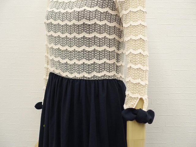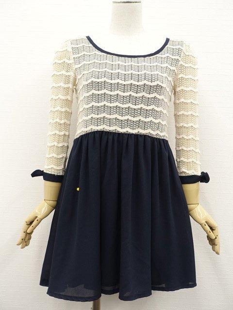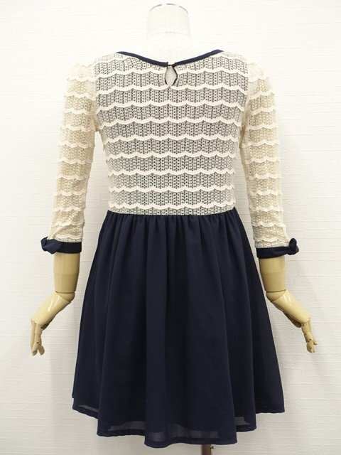デザイン 7分袖 ラウンドネック レースワンピース 2 ネイビー×生成