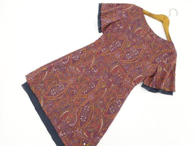 ひざ丈 半袖 Uネック ワンピース 36 ネイビー地 マルチカラー ペイズリー風柄