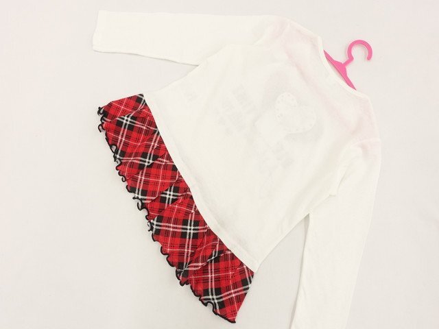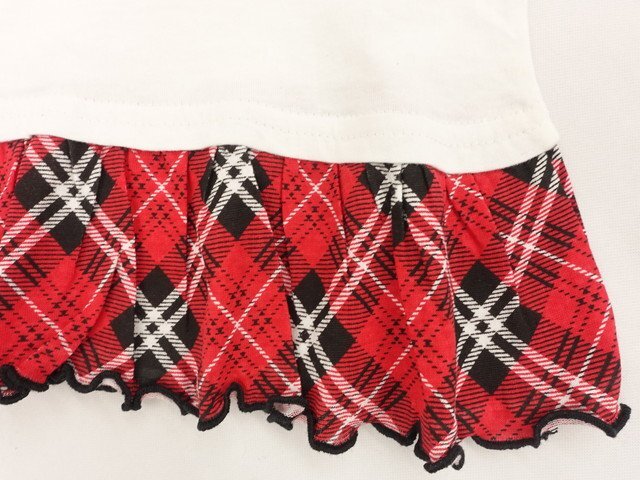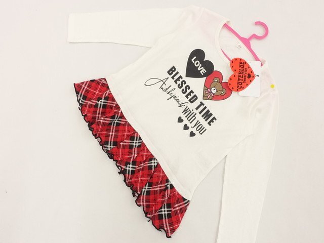 長袖 ラウンドネック チュニック 110 ホワイト地 ブラック 英字&レッド×ブラック チェック柄 【メール便可】