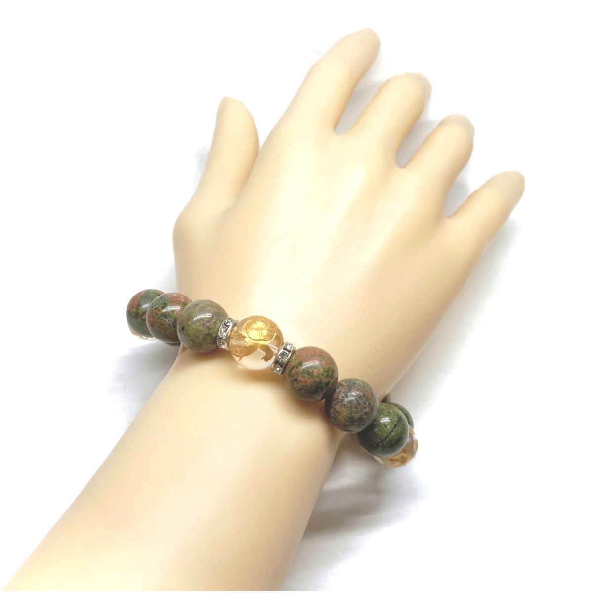 こちらは、四神獣金彫水晶とユナカイトを組み合わせたパワーストーンブレスレットです。四神獣は、中国の伝説で4つの方向(東西南北)を守護する神聖な神。四神獣、厄災から身を守り、多くの運気を呼び込むと言われております。石大きさは程よくインパクトのある12mm玉で内周 約17cmです。 数に限りがございますので気になる方はお早めにどうぞ。