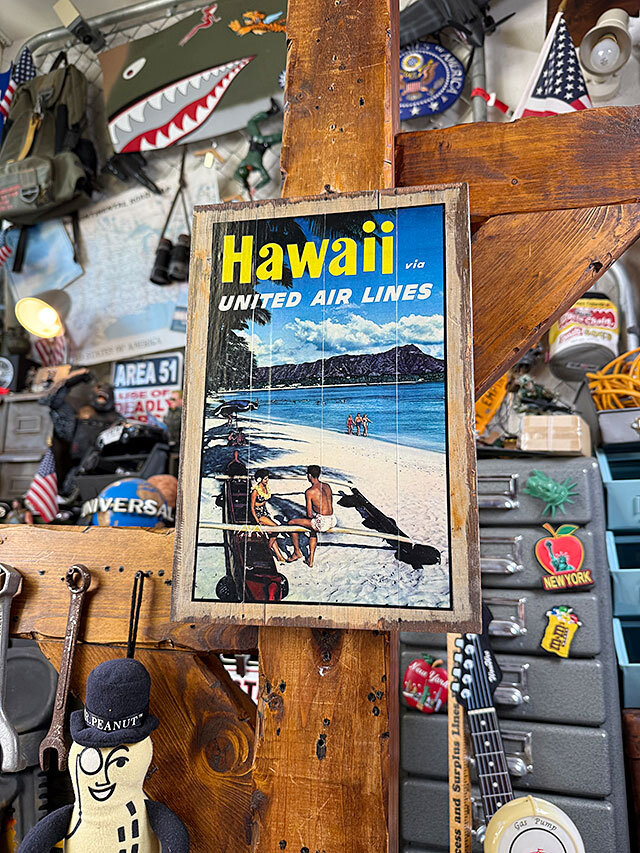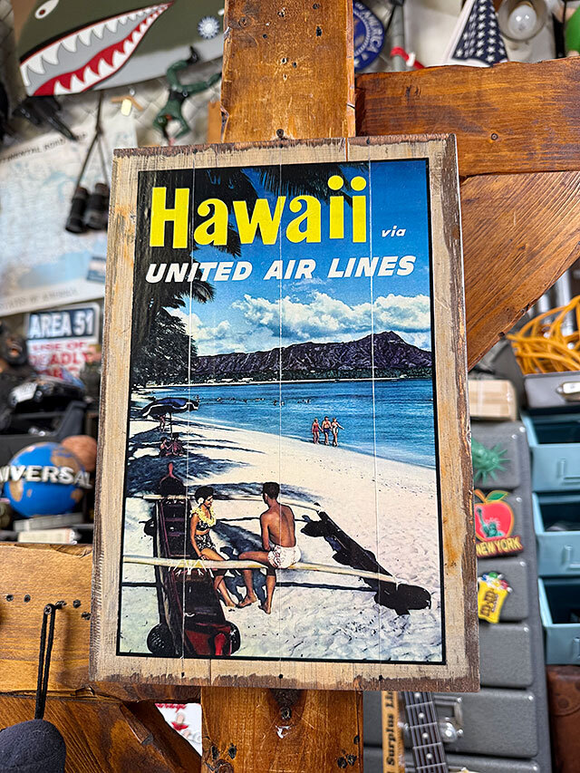 この看板は旅を案内する昔の広告、いわゆるトラベルポスターと呼ばれるモノをウッドサインとして復刻させたって逸品なんです。