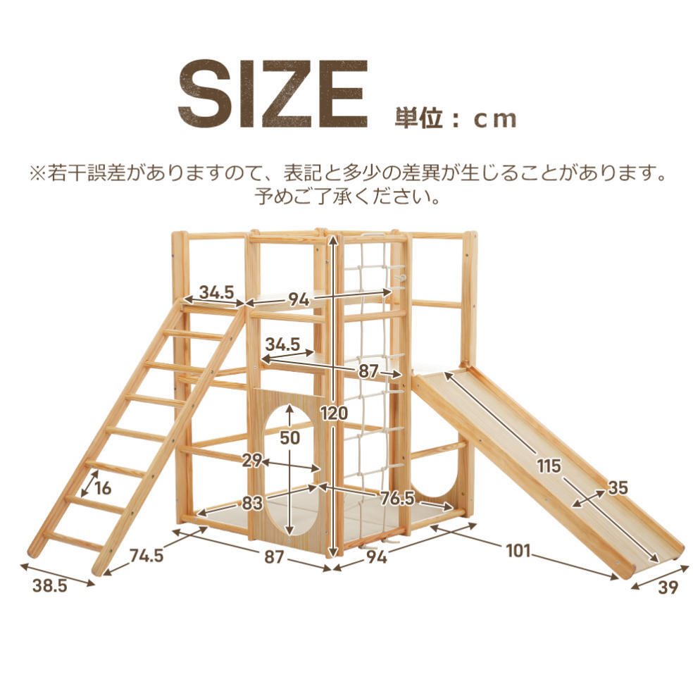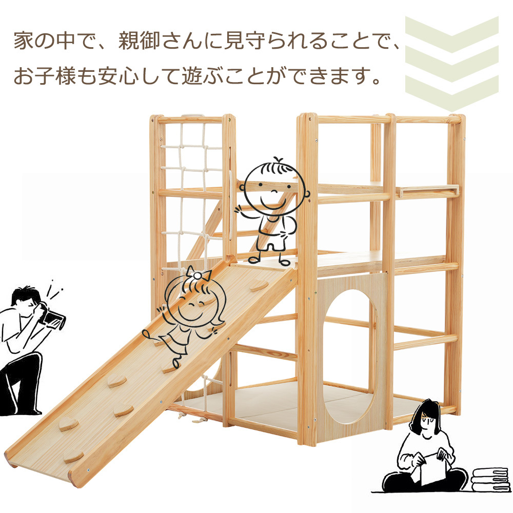 • 【頑丈だけでなく、どんなインテリアにも馴染む!】ジャングルジムは松の木とプライウッドを使用。 肌で感じる天然木 、頑丈で変形しにくいです。材は安心の無着色。木目が綺麗な自然素材がお子様の感性を豊かに養います。※荷重の負荷が大きい踊り場、すべり台と通路は強度あるプライウッドを使用しています。