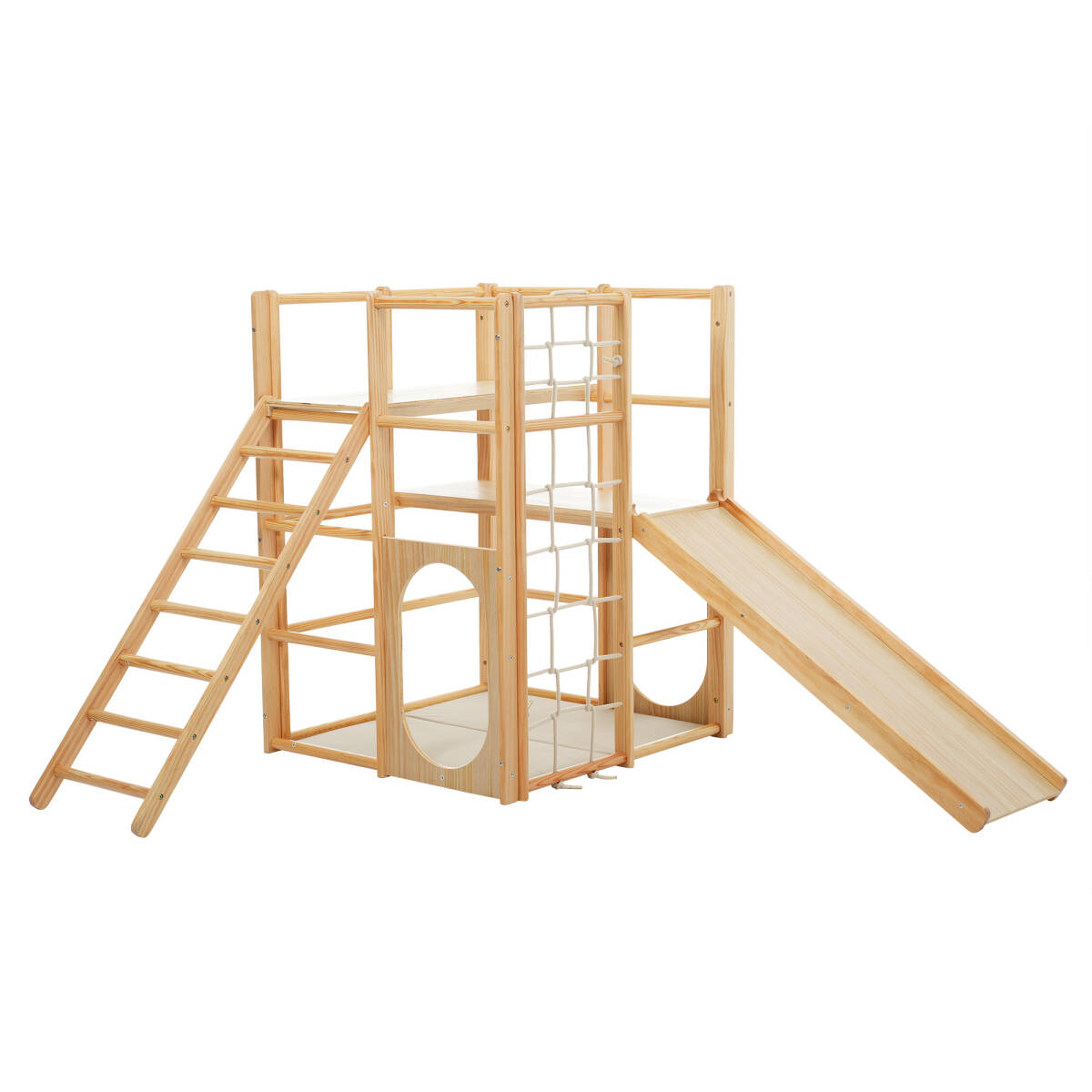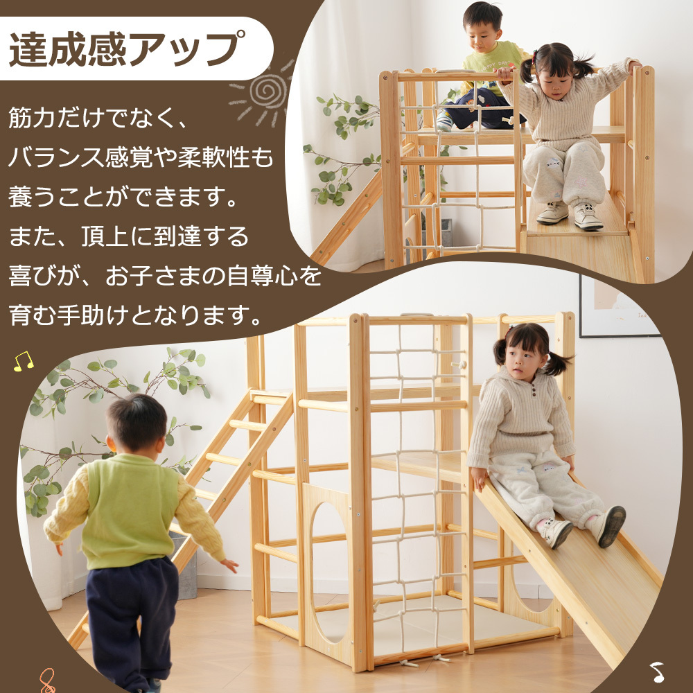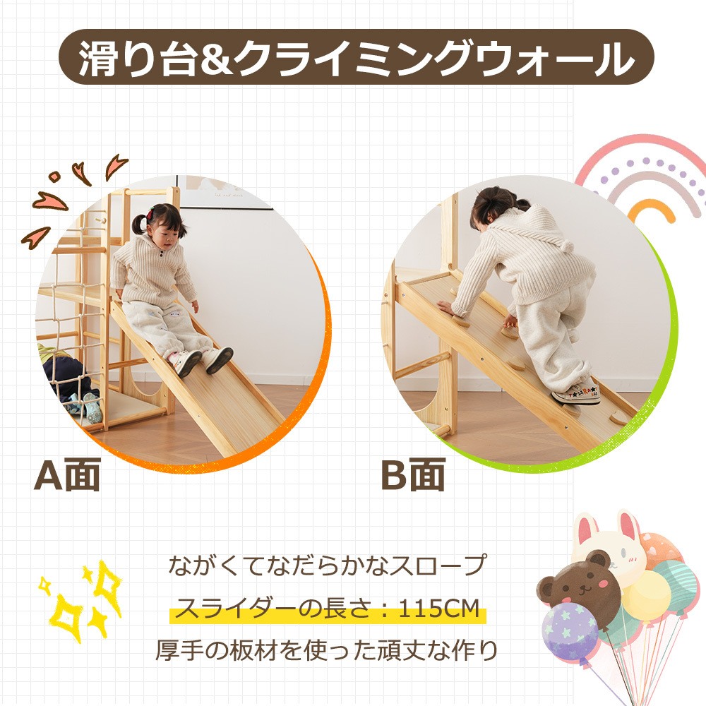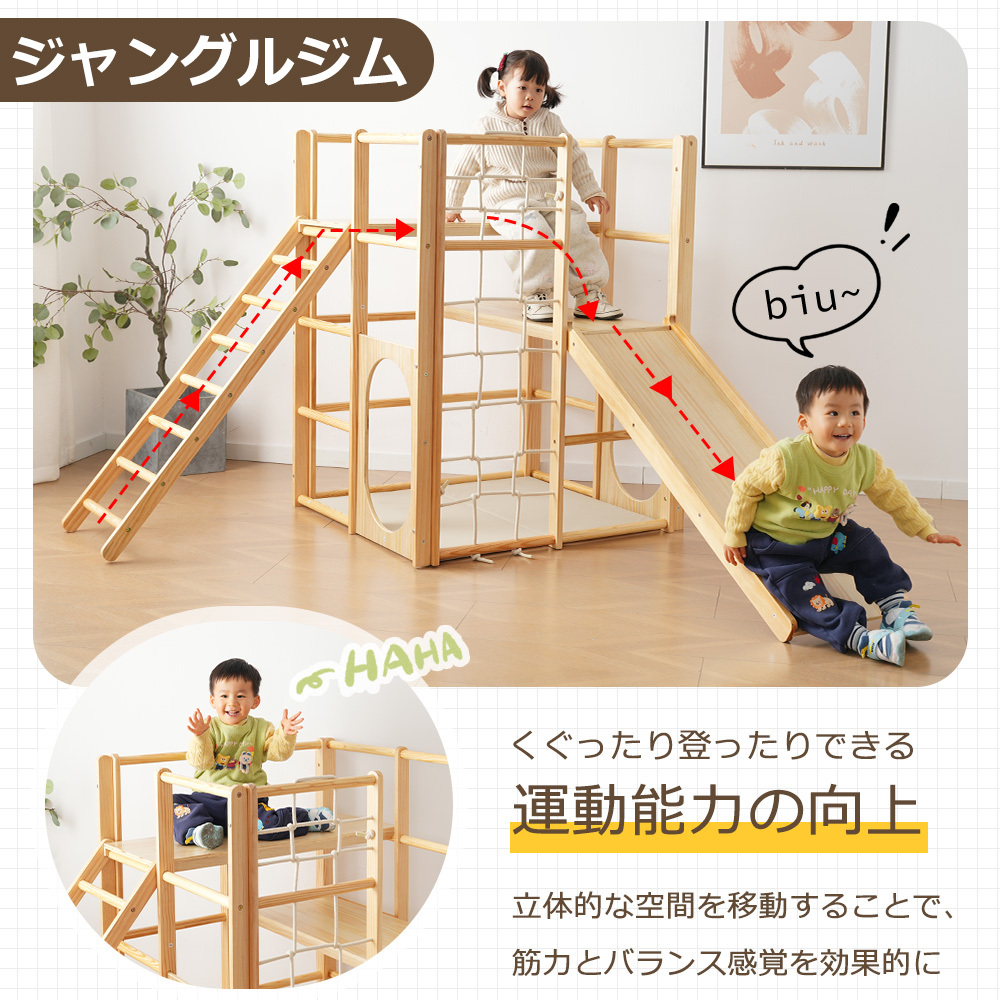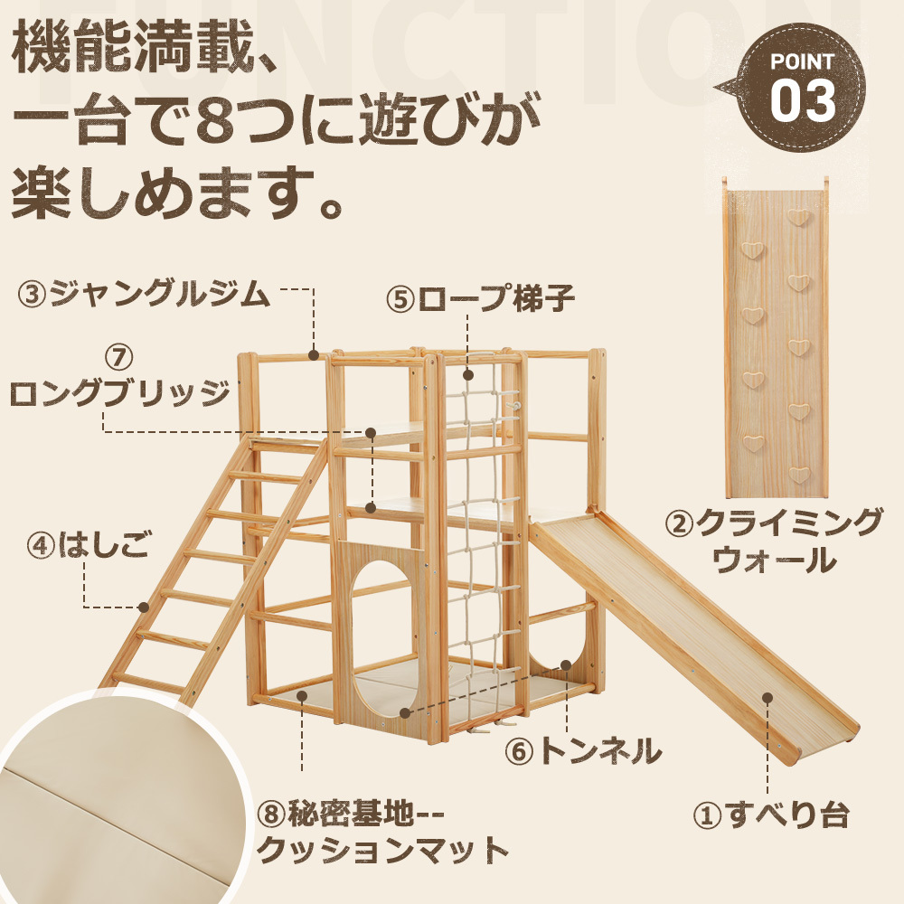 8in1 ジャングルジム 天然木 すべり台 滑り台 クライミングウォール付き 秘密基地 耐荷重60kg 多機能 木製 屋内 室内用 大型遊具