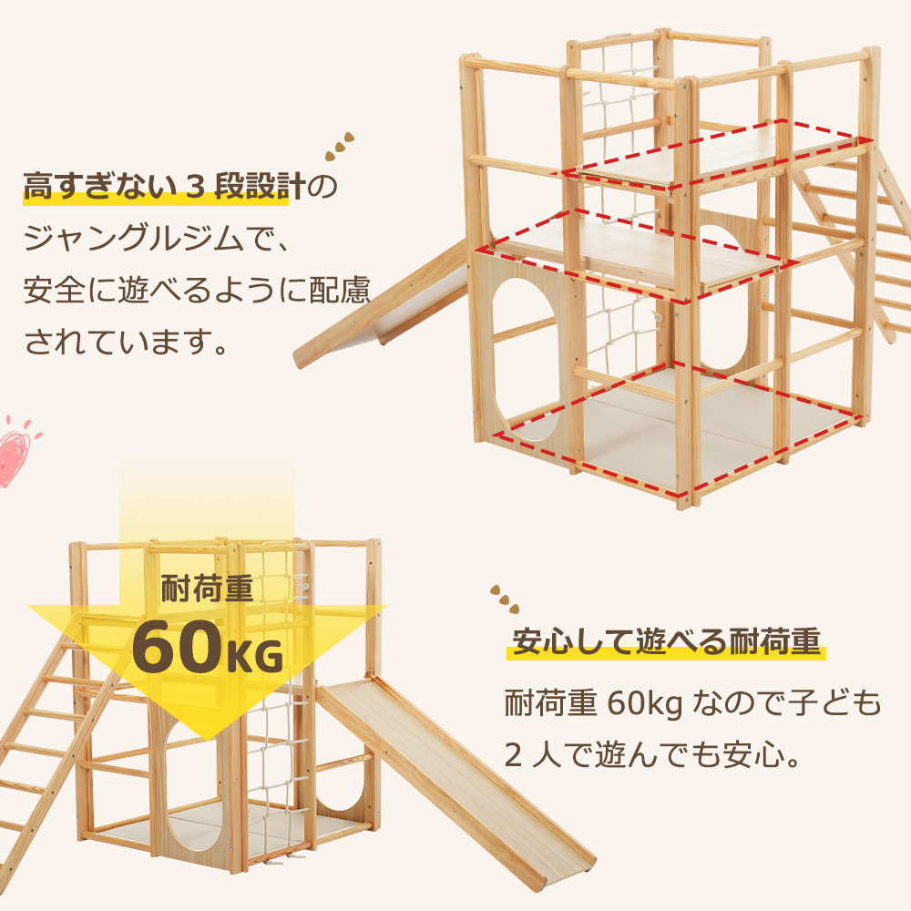 • 【安全面へのこだわり】怪我の危険を最小限に抑えるため、丁寧に仕上すべての角は丸く加工され、表面もしっかりと研磨されています。指が挟まりにくい設計 指を挟まないよう隙間が少ない設計に。高すぎない 3段設計のジャングルジムで、安全に遊べるように配慮されています。安心して遊べる耐荷重 耐荷重60kgなので子ども2人で遊んでも安心。