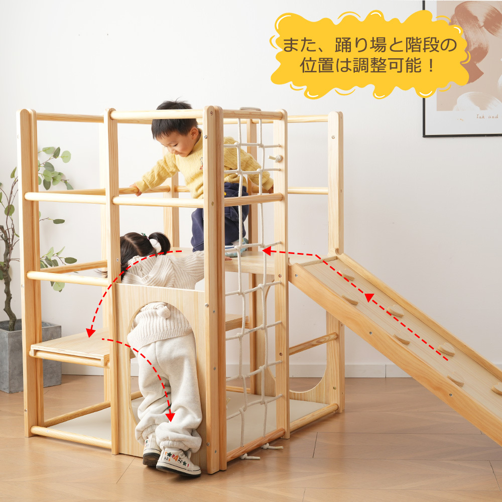 • 【ジャングルジム】くぐったり登ったりできる 運動能力の向上 立体的な空間を移動することで、筋力とバランス感覚を効果的に鍛えられます。また、踊り場と階段の位置は調整可能!