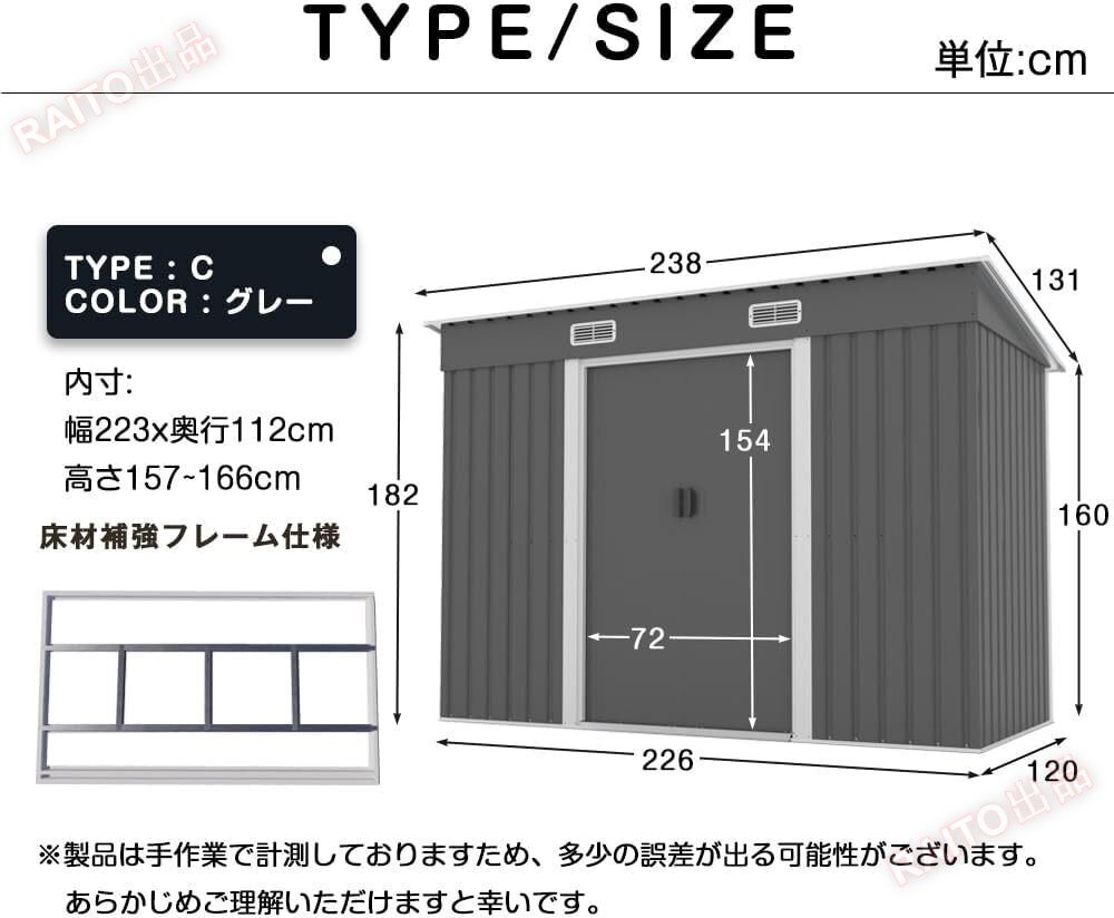 • 【床材補強フレーム付き】①構造安定:補強フレームはしっかりとした基礎を提供し、安定性を高め、沈下や傾きを防ぎます。②防湿・防水:プラスチックまたは木製の床材を敷くことで、防水効果を発揮します③耐震性能:地震や台風の際に力をよりよく分散・吸収し、構造的な損傷のリスクを減らします。(アンカー工事は必ず行ってください。)