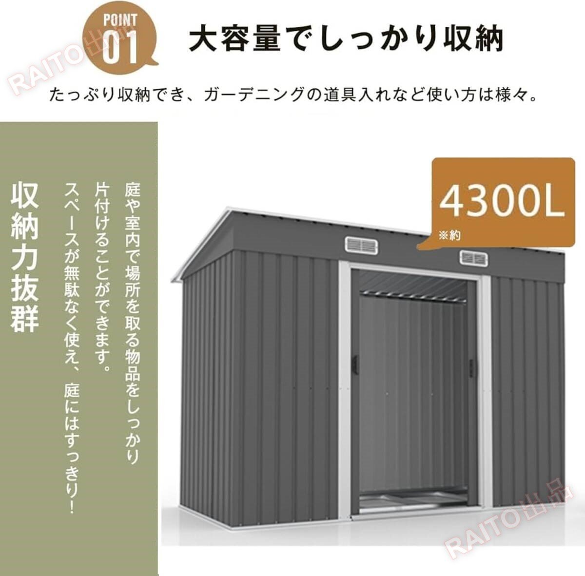 • 【屋根の溝は排水に役立つ】内部は濡れないために、斜面を設計しました。雨が降ると、屋根にたまることなく、斜面と凹槽を経由して地面に流れ落ちます。湿気から工具を守る頑丈で耐久性があり、変形しにくい、悪天候から内部の物品を保護します。