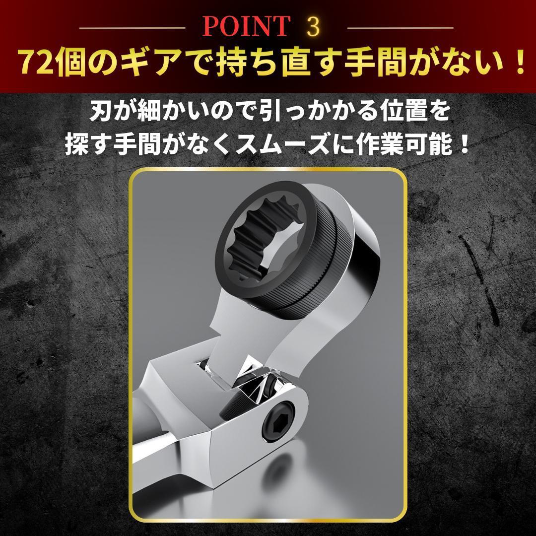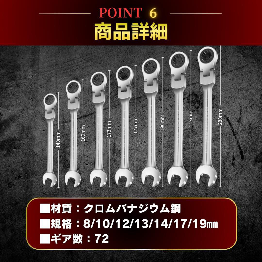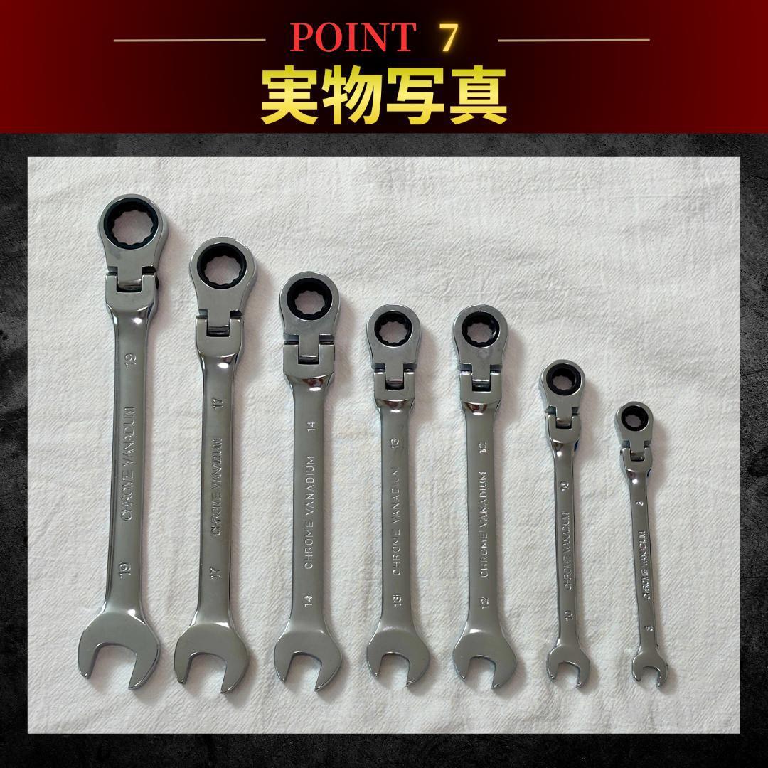 | ・ギア数:72山 ・首振り角度:0〜180度 ・内容:7本セット ・サイズ:8mm / 10mm / 12mm / 13mm / 14mm / 17mm / 19mm ・材質:クロムバナジウム鋼(高耐久) ・仕上げ:鏡面メッキ仕上げ | |||