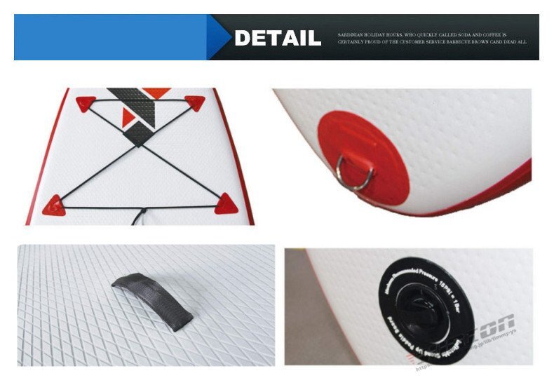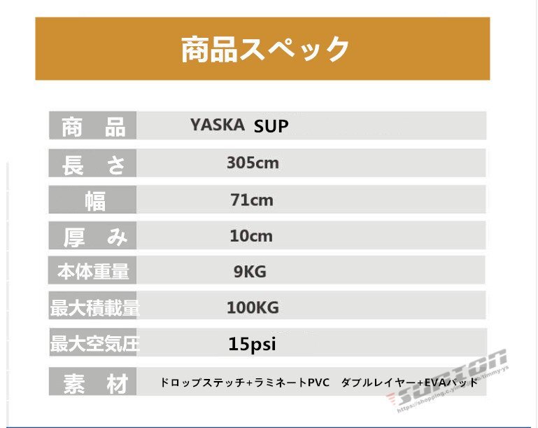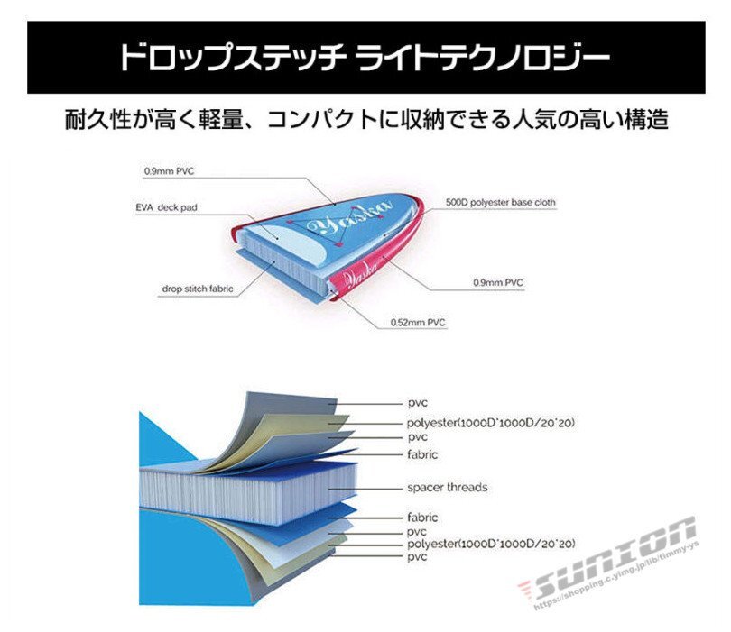 【商品特徴】■サーフィンや水上散歩などが楽しめるスタンドアップパドルボードです。■層構造で機械のみの加工ではなく、丁寧に一台ずつ手作業で立体に加工された本格SUPボード。■SUPを楽しみながら体幹トレーニングできます。■空気を入れて使用するインフレータブル式です。■使用後は空気を抜けるので収納は非常にコンパクトです。■荷物はゴムのバンジーコードでしっかり固定できます。■ボードが沖に流されないようにリーシュコードが付いています。【商品内容】:パドルボード本体/パドル/空気入れ/リペアキット/リーシュコード【素 材】:ドロップステッチ+ラミネートPVC ダブルレイヤー+EVAバッド【サイズ】:(約)305cm×71cm×10cm etc.【重 量】:(約)9.0kg【積載重量】:(約)100kg【最大空気圧】:15psi○使用上の注意事項○※改造/本来の目的以外/強い衝撃などはお控え下さい。※ 本製品を使用したことによる直接的&間接的に生じた事故、損害、破損についての責任は負いかねますので、ご注意ください。※こちらの商品は大型配送の為、返品対象外商品です。○以上を了承の上ご購入ください○