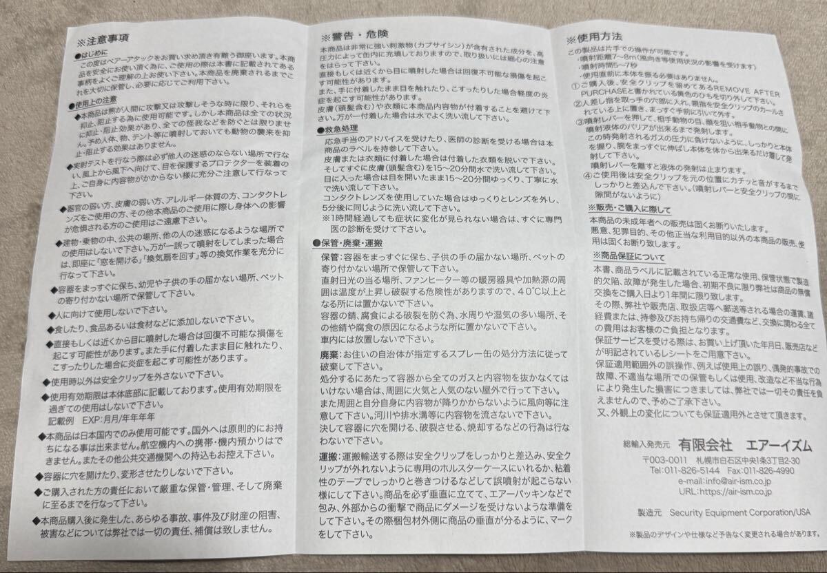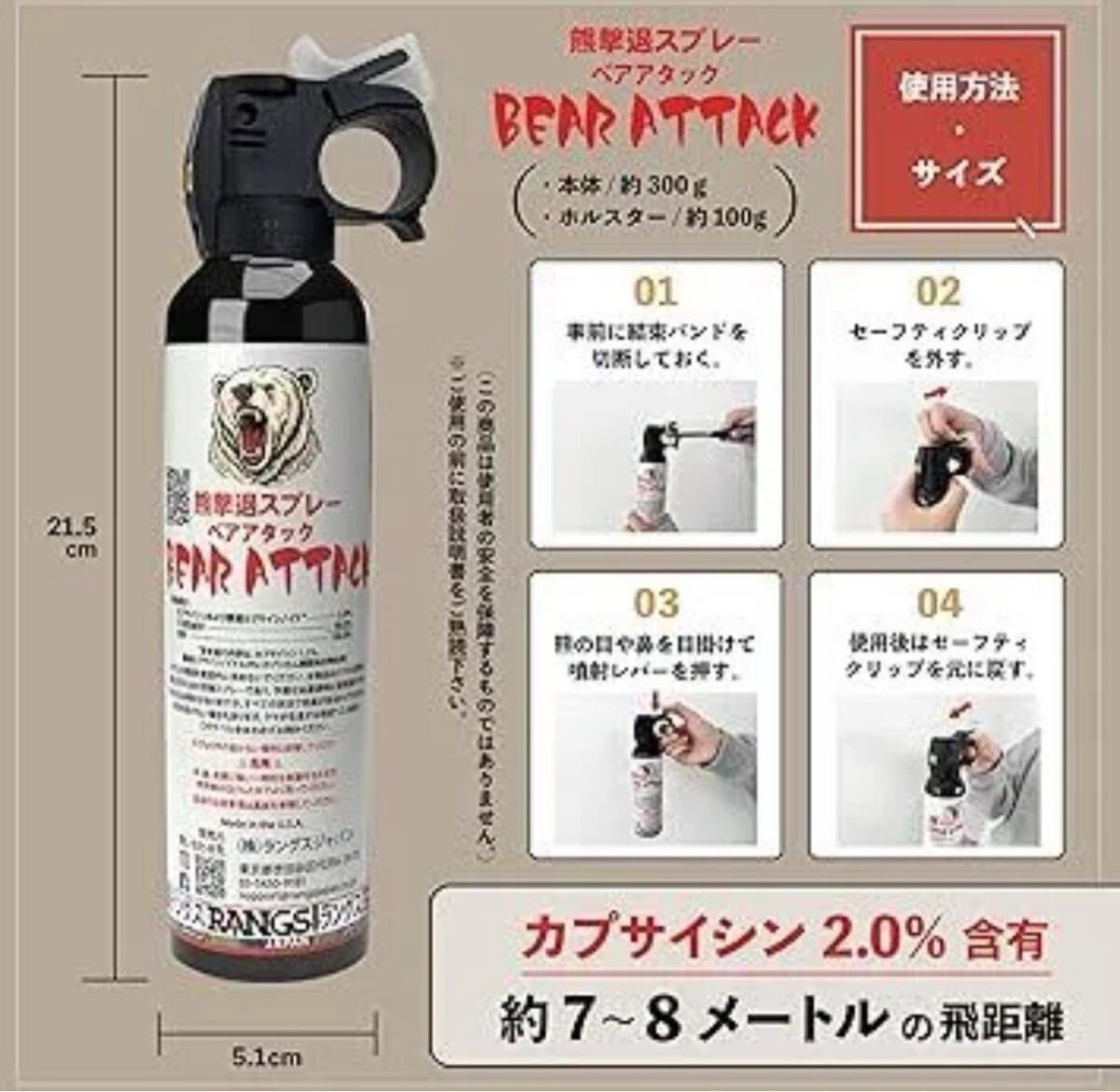 噴射回数について:ベアアタックのUSAメーカーの仕様書には噴射時間は約5秒から7秒と記載されておりラングスジャパンは取説にはその内容通り翻訳しております。 3秒づつ噴射した場合条件が良ければ2回近く使えます。 ※実際の噴射時間や使用回数は、使用環境や操作状況により多少前後する場合もあります。 発送詳細 決済が確認できましたら、