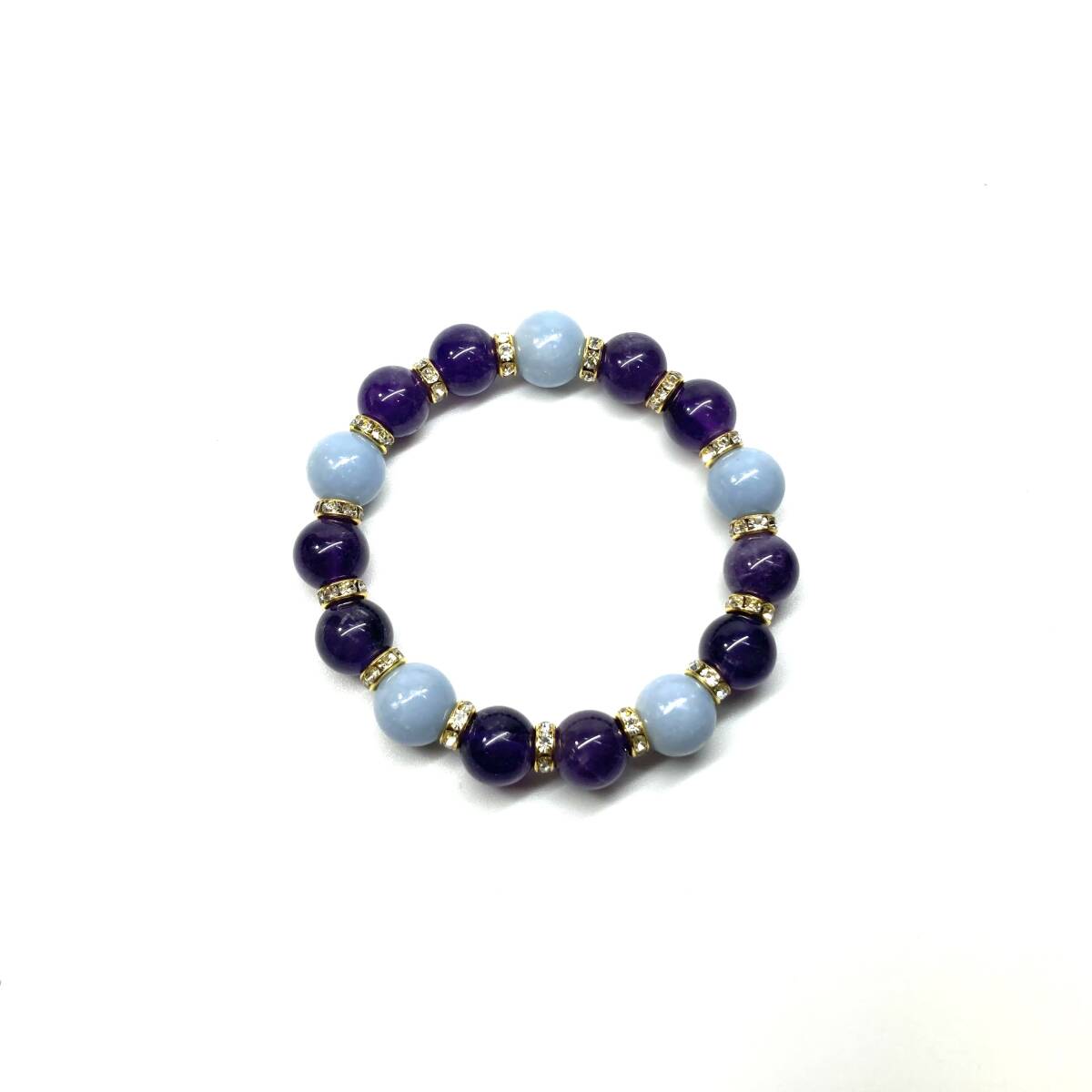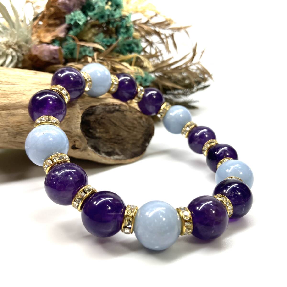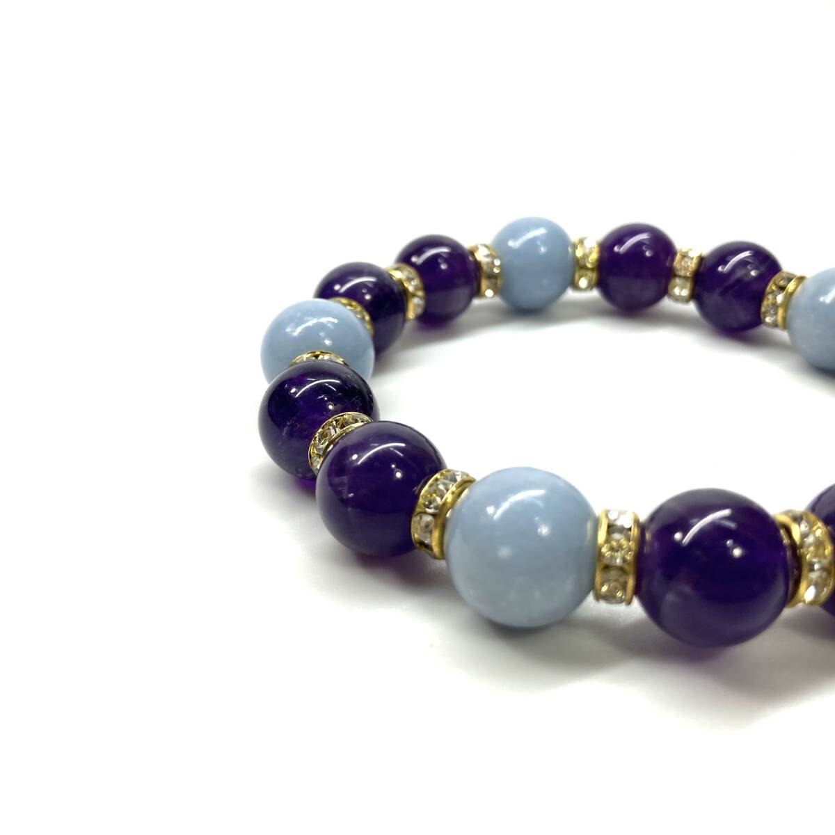 こちらは、エンジェライトとアメジストを組み合わせたパワーストーンブレスレットです。間にはロンデルを挟み高級感あるデザインに仕上げております。石大きさは12mm玉を使用して内周約18cmです。気になる方は是非この機会にどうぞ。