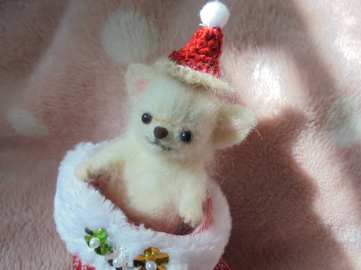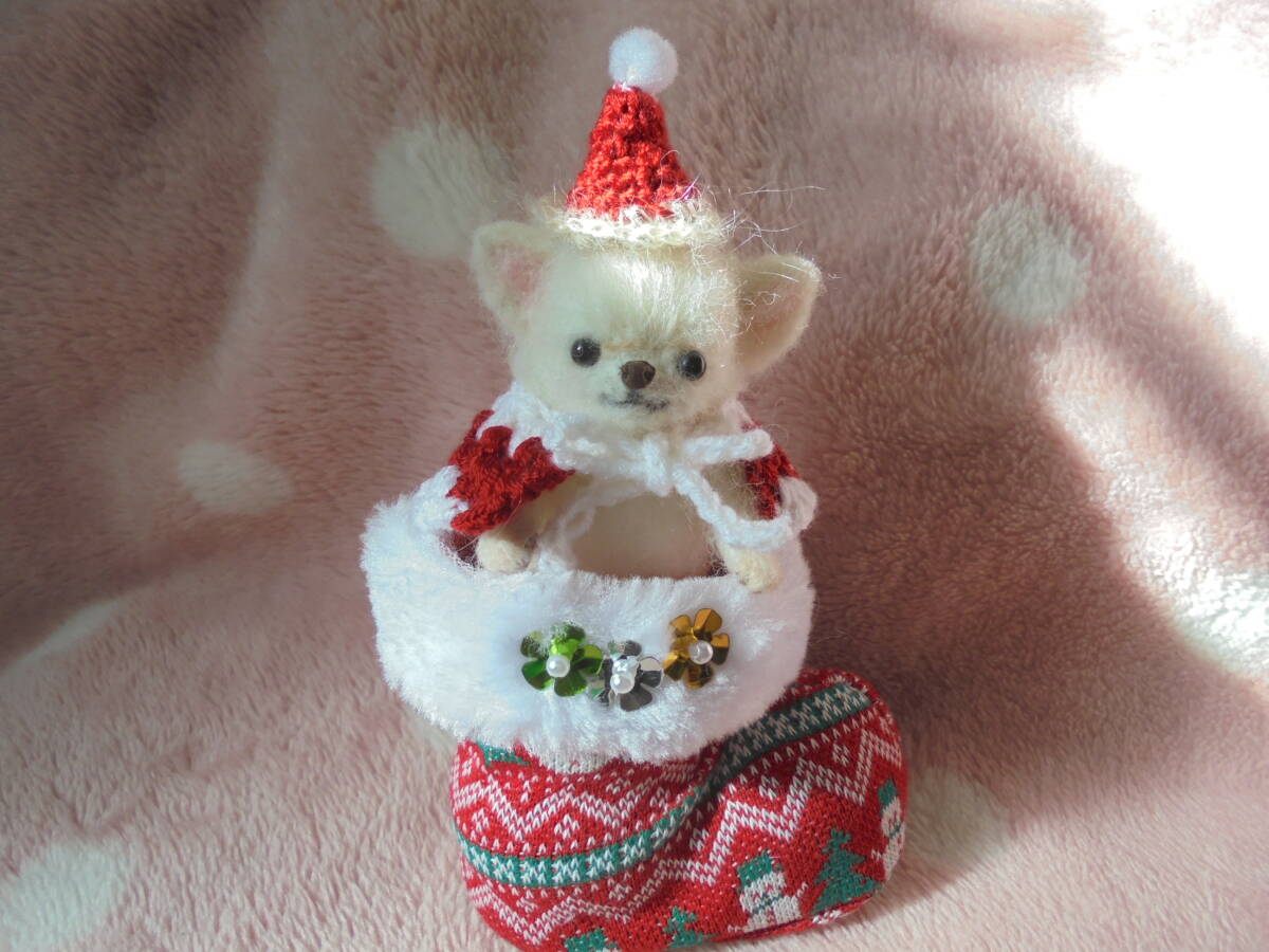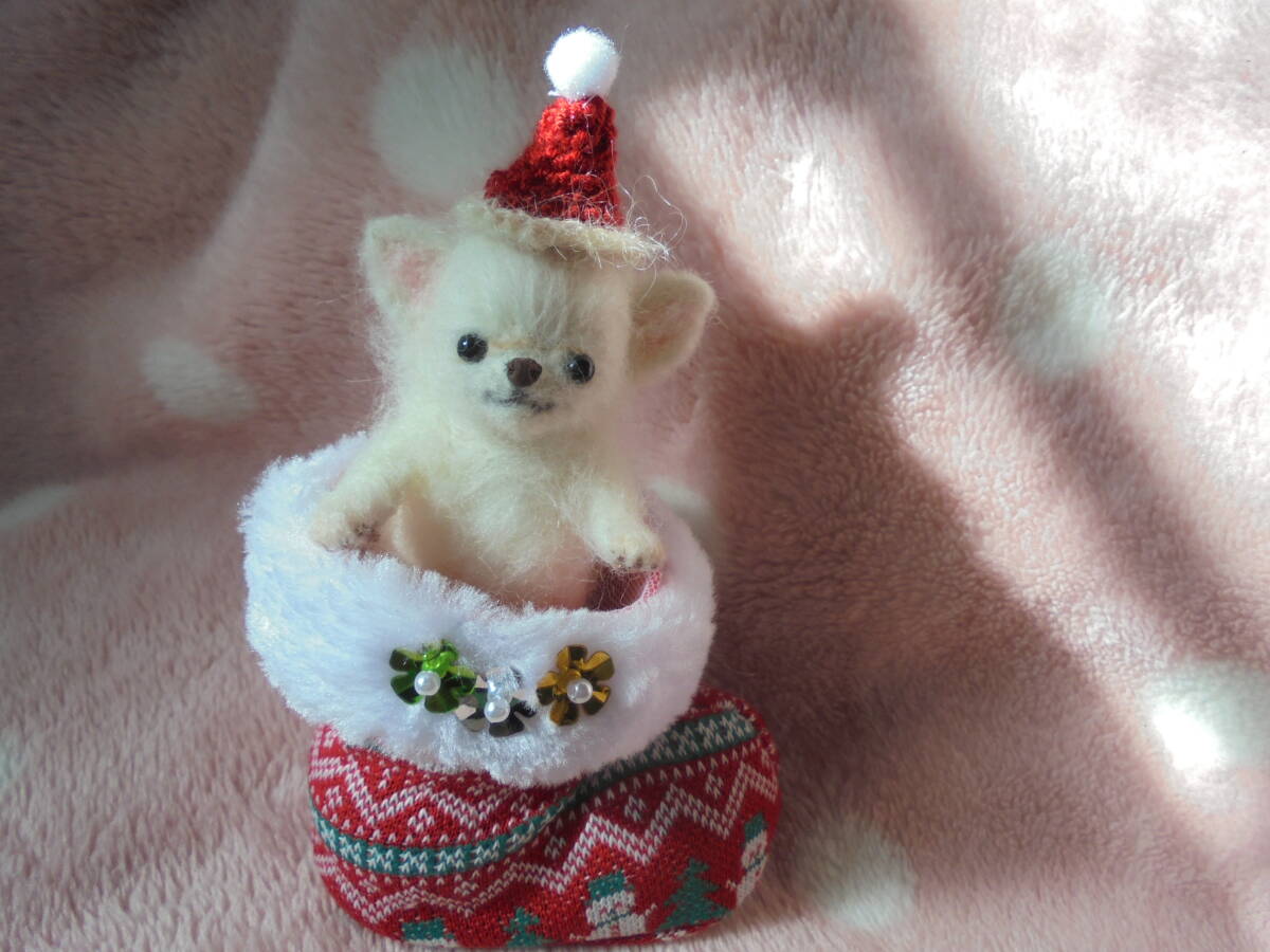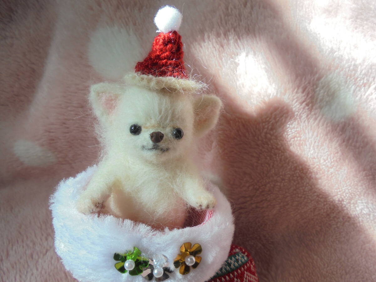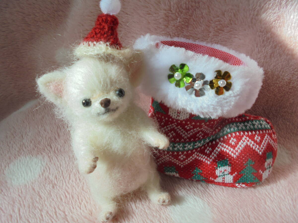 ☆ハンドメイド 羊毛フェルト  チワワホワイト赤ちゃん♪ クリスマス♪ 身長約10.5センチ♪