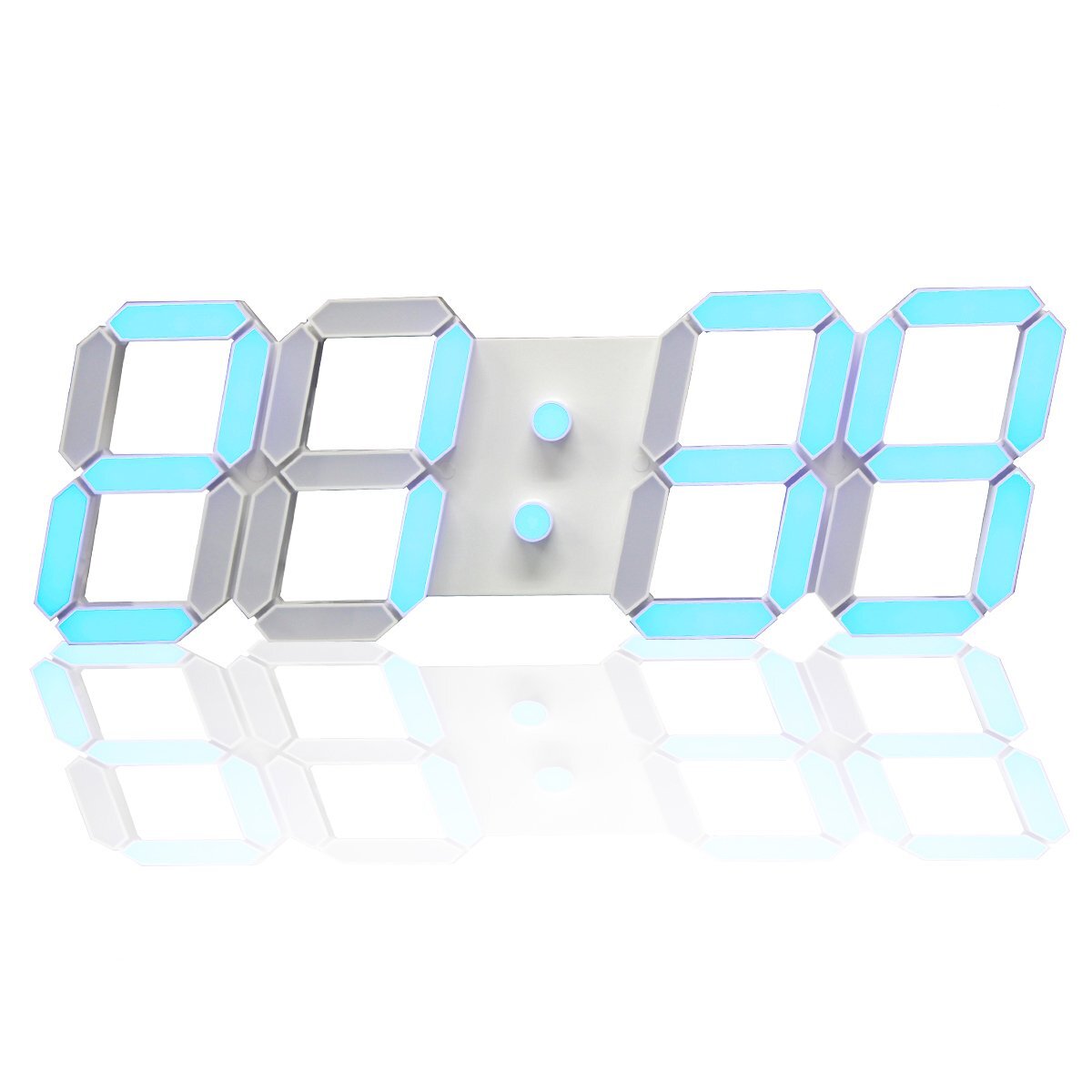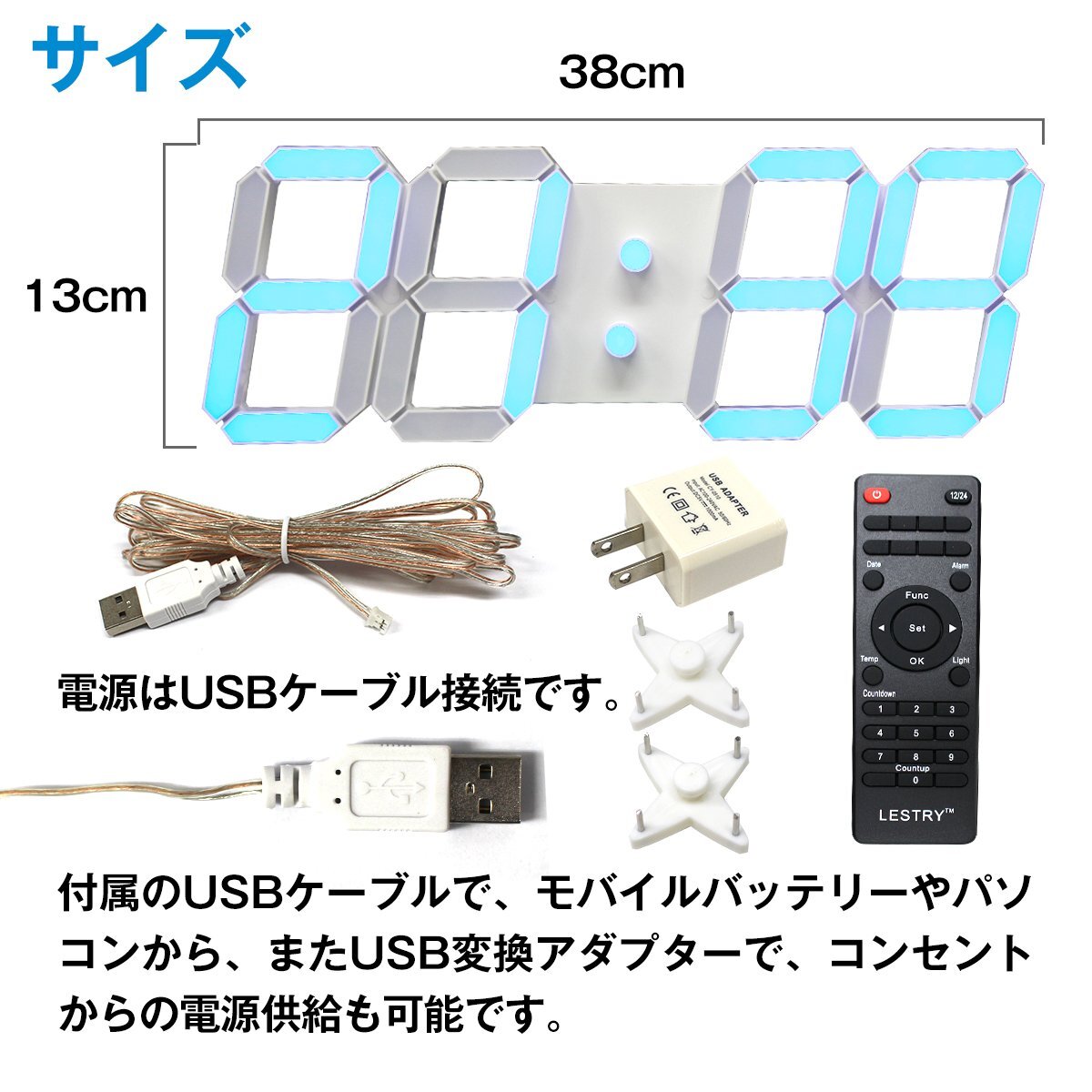 LEDデジタル3D時計 本体カラー:ホワイト/白 LED発光カラー:ブルー/青 明るさ調整可能 リモコン付き